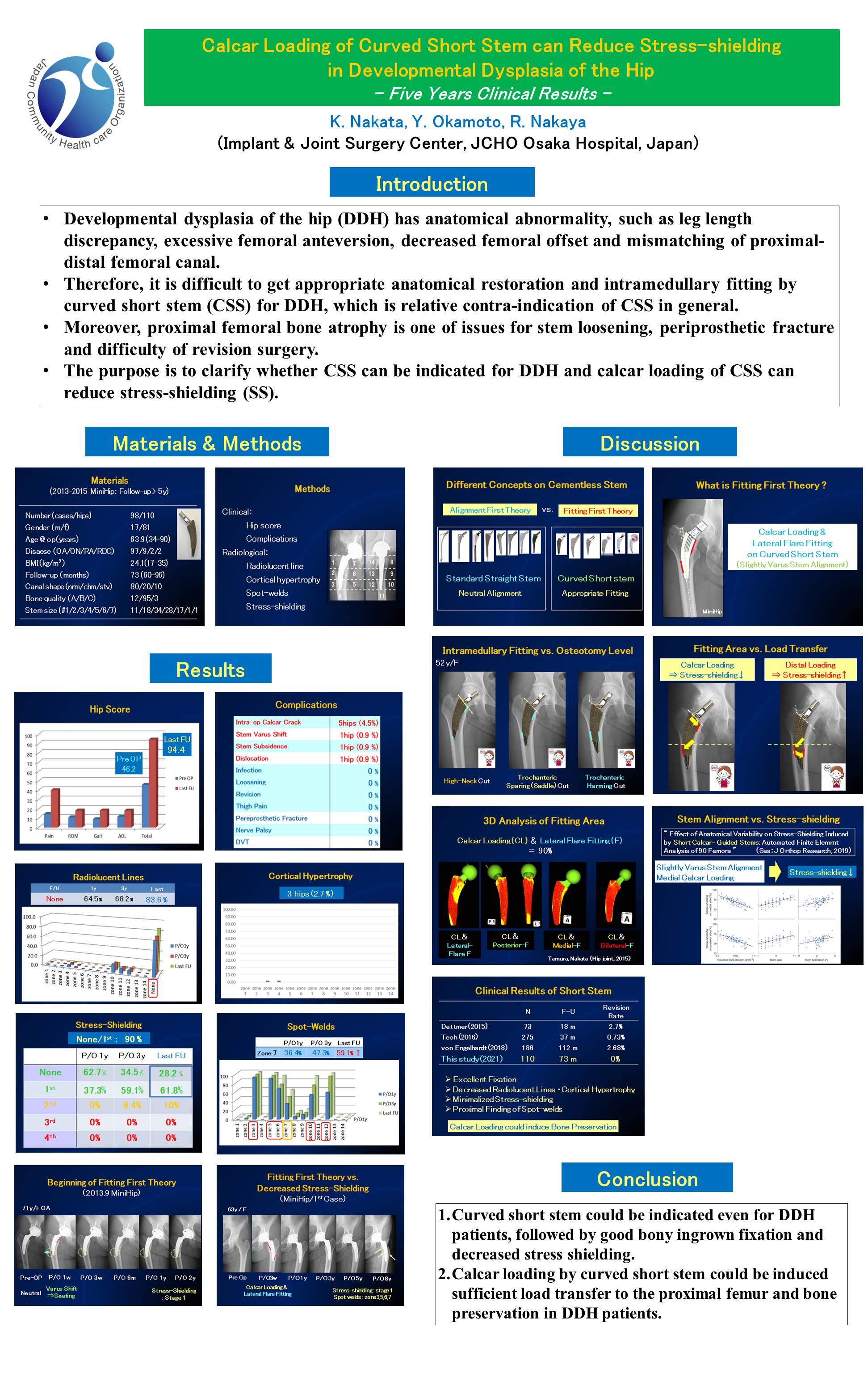 Developmental dysplasia of the hip (DDH) has anatomical abnormality, which is relative contra-indication of curved short stem (CSS) in general. The purpose is to clarify whether CSS can be indicated for DDH and calcar loading of CSS can reduce stress-shielding.