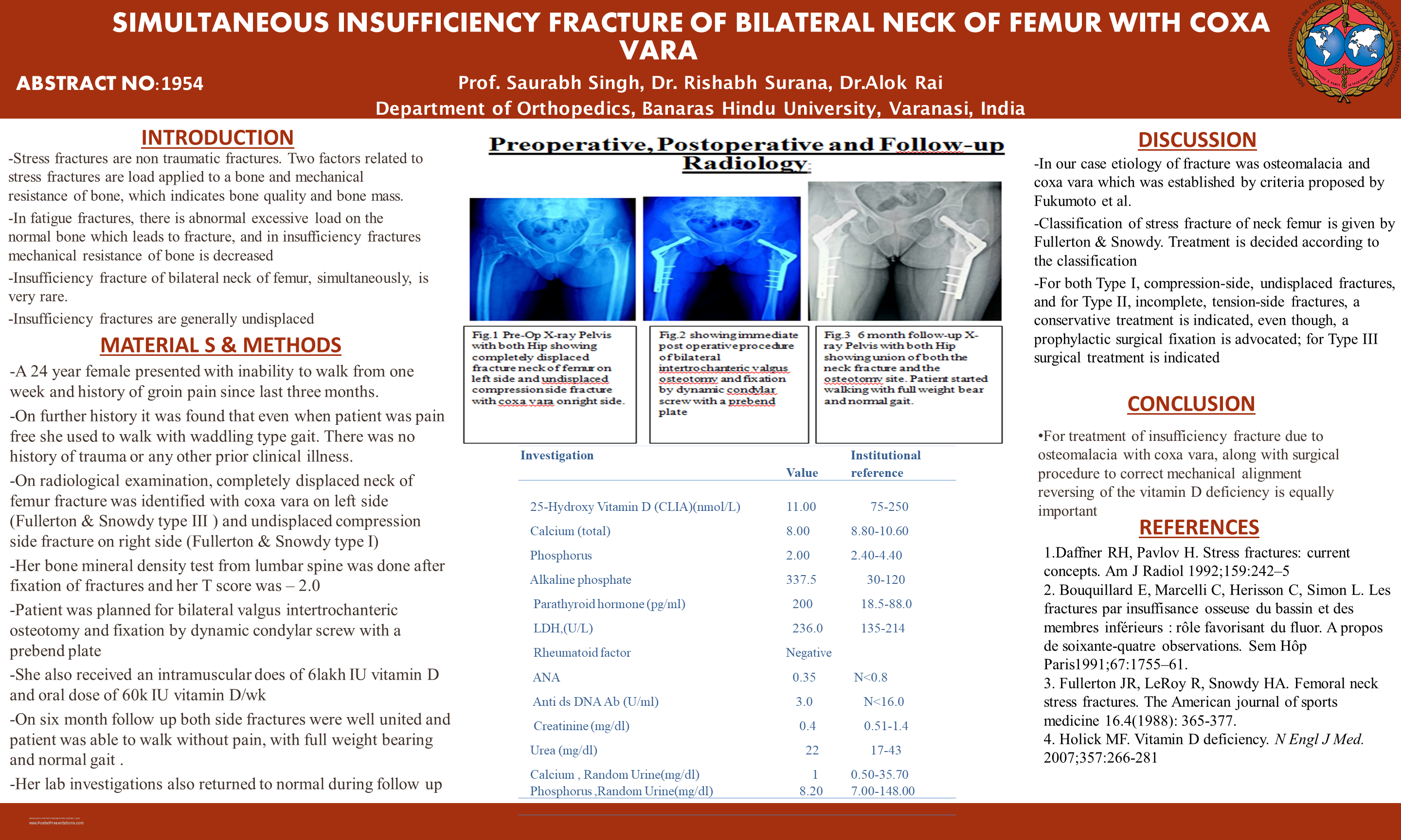 Background: Insufficiency fracture of bilateral neck of femur, simultaneously, is very rare. Insufficiency fractures are generally undisplaced.We present a rare case, of Insufficiency fracture of bilateral neck of femur with coxa vara in a young female Method: A 24 year female presented with inability to walk from one week and history of groin pain since last three months, even when patient was pain free she used to walk with waddling type gait. There was no history of trauma. On radiological examination, completely displaced neck of femur fracture was identified with coxa vara on left side (Fullerton & Snowdy type III ) and undisplaced tension side fracture on right side (Fullerton & Snowdy type II ).On laboratory workup, serum vitamin D level was 11nmol/lt ( range 75-250), calcium level was 8.0mg/dl ( range 8.8-10.6), parathyroid hormone level was 200pg/ml(range 18-85), phosphorus level was 2mg/dl(range 2.4-4.4). Other lab investigations, endocrinological profile and rheumatological profile were normal. Her bone mineral density test from lumbar spine was done after fixation of fractures and her T score was – 2.0.Patient was planned for valgus intertrochanteric osteotomy and fixation by dynamic condylar screw with a prebend plate. She also received an intramuscular does of 6lakh IU vitamin D and oral dose of 60,000 IU vitamin D every week. Result: On six month follow up both side fractures were well united and patient was able to walk without pain, with full weight bearing and normal gait .Her lab investigations also returned to normal during follow up.