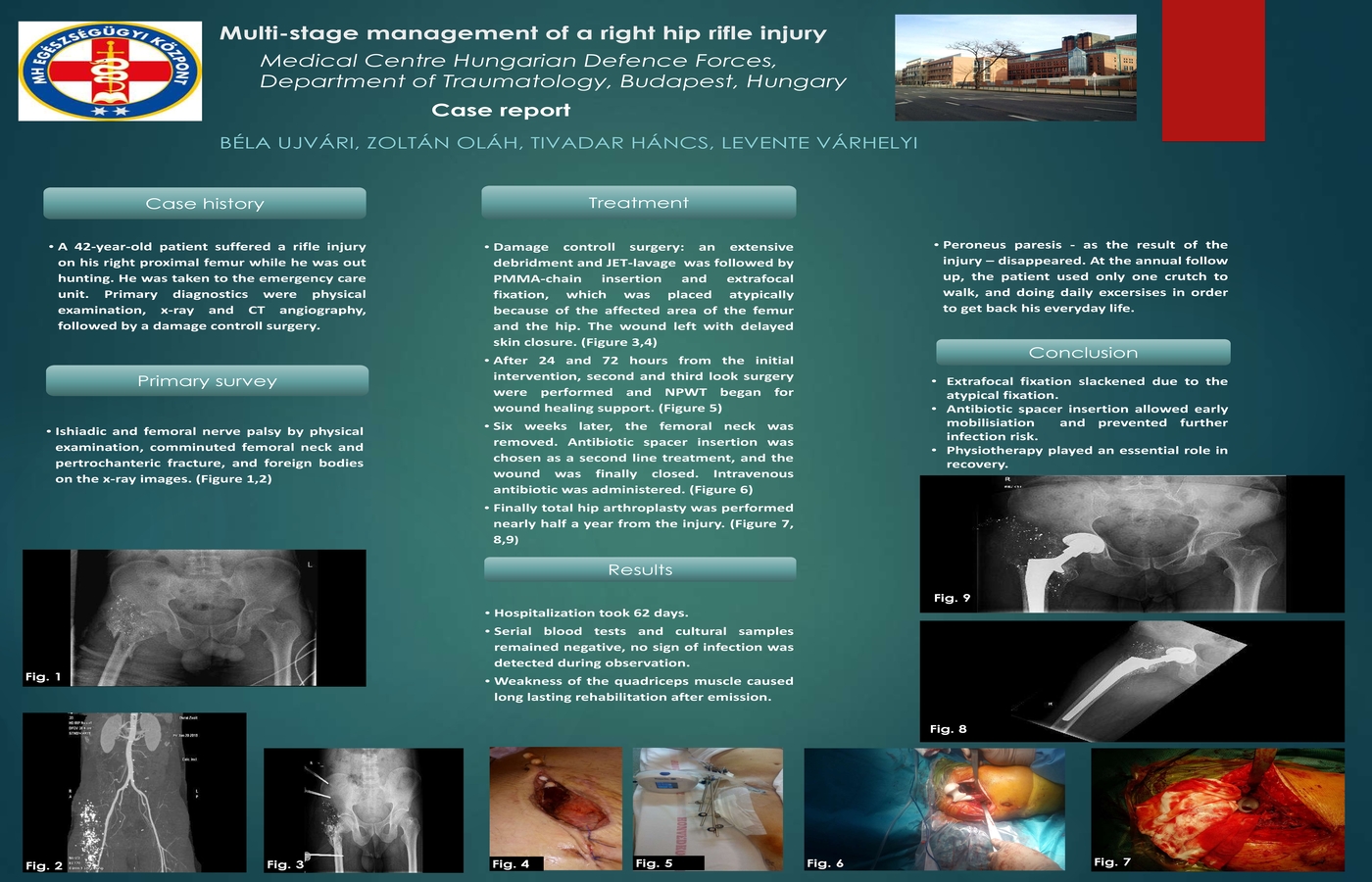 Primary the wound treated by delayed skin closure and later the healing was supported by NPWT therapy. After six weeks the ex-fix was removed and antibiotic spacer was inserted. Primary wound healing occured without any signs of infection. The neurological recovery of the extremity took almost a year. Low grade infection were excluded by serial labs and culture. Finally the patient underwent a total hip arthroplasty with good results.