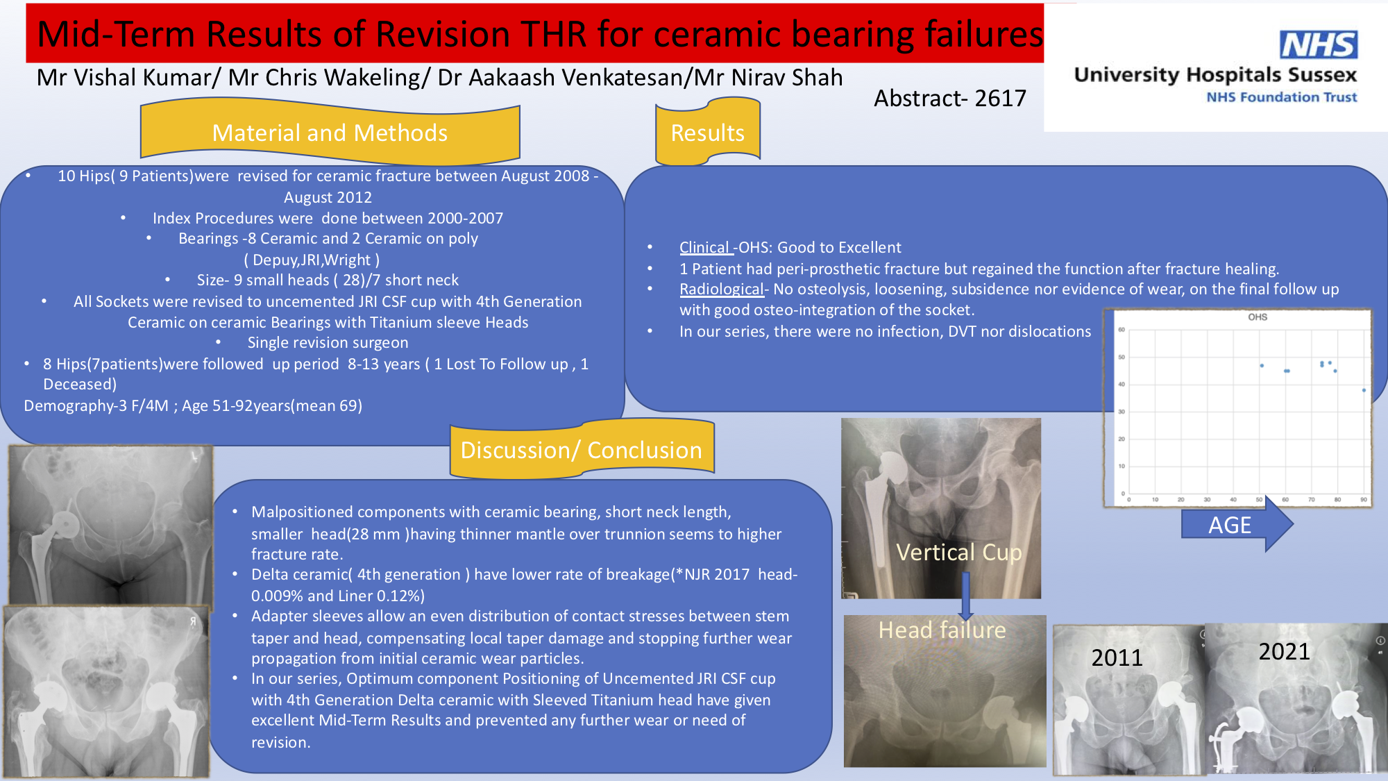 Introduction: Use of ceramic bearings in total hip replacement is increasing, especially in younger patients but there are still reports of Ceramic failures and dealing with the revision surgeries in these cases is challenging. Material and Methods: We present our experience of 10 hips (9 patients) who underwent revision for ceramic failures between 2008-2012.Seven patients reported squeaking. There were 8 head and 3 ceramic liner fractures. Seven patients had a small head (28mm) with short neck. All patients had revision with titanium sleeve with ceramic bearing with revision of the socket to a uncemented cup. One patient was lost to follow up and 1 deceased. Eight hips (7 patients) were followed up clinically and radiologically. Post-operative Oxford Hip Scores were obtained, and the radiographs were accessed for osteolysis, loosening, subsidence and osteo-integration. Results: All patients had good to excellent function and Oxford Hip Score except one patient who had periprosthetic fracture and regained the function after the healing of the fracture. There were no Re-revisions for bearing wear, osteolysis. Radiological follow up did not show any osteolysis or loosening in any of the hips. Discussion: There are limited follow up results of revision hips following ceramic failures. Our Study highlights the importance of early diagnosis, prompt surgery with extensive debridement and use of appropriate titanium sleeve with revised ceramic bearing couple can yield satisfactory mid-term results. Conclusions: Our study shows good clinical and radiological mid-term results of ceramic failure revision hip replacements.