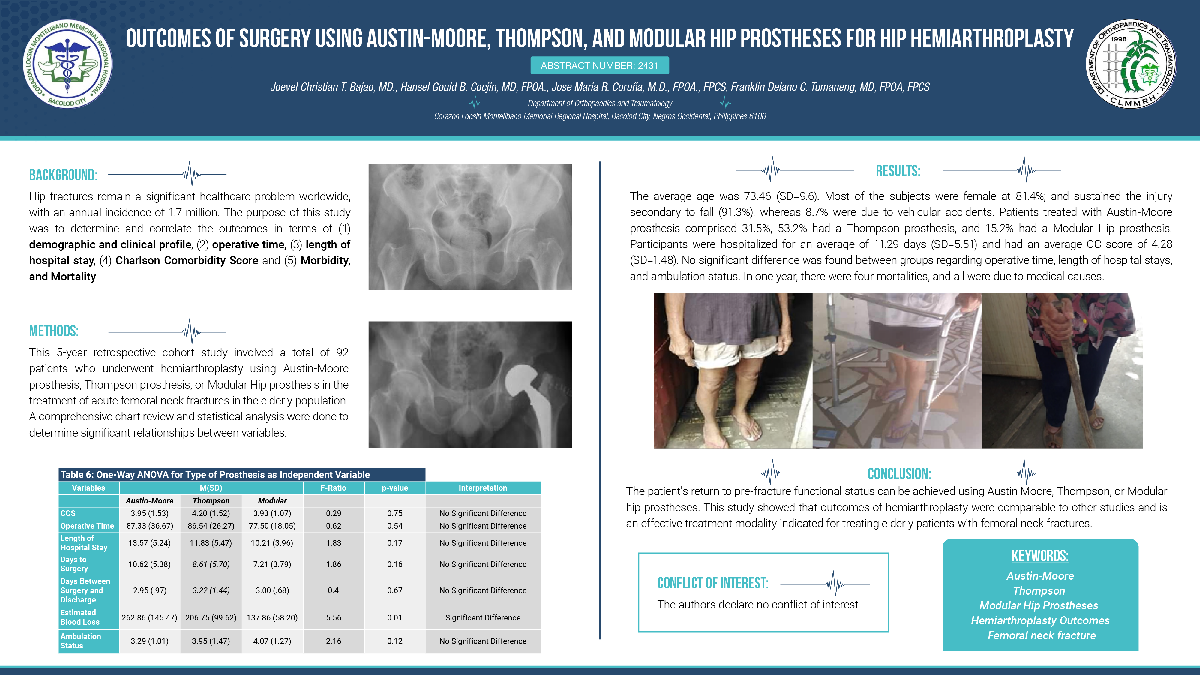 Background: Hip fractures remain a significant healthcare problem worldwide, with an annual incidence of 1.7 million. One-year mortality rates currently range from 14% to 36%, and care for these patients represents a major global economic burden. The purpose of this study was to determine and correlate the outcomes in terms of (1) demographic and clinical profile, (2) operative time, (3) length of hospital stay, (3) Charlson Comorbidity Score (CCS) and (4) Morbidity, and Mortality. Methods: This 5-year retrospective correlational study involved a total of 92 patients who underwent hemi-arthroplasty in the treatment of acute femoral neck fractures in the elderly population. A comprehensive chart review and statistical analysis was done to determine significant relationships between variables. Results: The average age was 73.46 (SD=9.6). Majority of the subjects were female at 81.4%; and sustained the injury secondary to fall (91.3%), whereas, 8.7% were due to vehicular accidents. Patients who were treated with Austin-Moore prosthesis comprised 31.5%, 53.2% had a Thompson prosthesis, and 15.2% had a Modular Hip prosthesis. Participants were hospitalized for an average of 11.29 days (SD=5.51) and had an average CCS of 4.28 (SD=1.48). No significant difference was found between groups in terms of operative time, length of hospital stay, and ambulation status. Conclusion: Return of the patient to his/her pre-fracture functional status can be achieved with the treatment of hemiarthroplasty. This study showed that outcomes of hemiarthroplasty were comparable to other studies and is a satisfactory treatment modality indicated for treating elderly patients with femoral neck fractures.