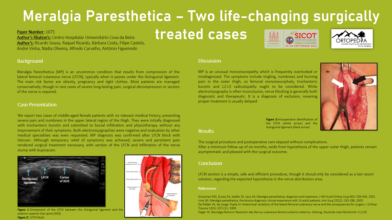 Background: Meralgia Paresthetica (MP) is an uncommon condition that results from compression of the lateral femoral cutaneous nerve (LFCN), typically when it passes under the inguinal ligament. Most patients are managed conservatively, though in rare cases of severe long-lasting pain, surgical decompression or section of the nerve is required. Case Presentation: We report two cases of middle-aged female patients with no relevant medical history, presenting severe pain and numbness in the upper lateral region of the thigh. They were initially diagnosed with trochanteric bursitis and submitted to bursal infiltration and physiotherapy without any improvement of their symptoms. Both electromyographies were negative and evaluation by other medical specialities was even requested. MP diagnosis was confirmed after LFCN block with lidocain. Although temporary relief of symptoms was achieved, severe and persistent pain rendered surgical treatment necessary, with section of the LFCN and infiltration of the nerve stump with bupivacain. After a minimum follow-up of six months, aside from hyposthesia of the upper outer thigh, patients remain asymptomatic and pleased with the surgical outcome. Discussion: MP is an unusual mononeuropathy which is frequently overlooked or misdiagnosed. The symptoms include tingling, numbness and burning pain in the outer thigh. While electromyography is often inconclusive, nerve blocking is generally both diagnostic and therapeutic. It is a diagnosis of exclusion, meaning proper treatment is usually delayed. Conclusion: LFCN section is a simple, safe and efficient procedure, though it shoud only be considered as a last resort solution, regarding the expected hyposthesia in the nerve distribution area.