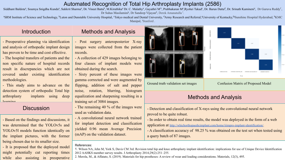 Methods and Analysis: Post-surgery lateral and anteroposterior X-ray images were collected from the patient records from Medical University of Tokyo and KMC Hospital. A collection of 927 images belonging to three classes were obtained. These images were augmented resulting in a total of 1921 images with 1762:159 train- validation split. After augmentation, these images were annotated by marking bounding boxes on the hip implants in the image. An additional query batch of 87 images was used for testing. The model used was YoloV5 which performed both detection of the implant in the image as well as informed the class of the implant. The set of 1921 augmented images along with their annotations were fed to the YoloV5 model for classification as well as detection. Inference on 149 test images resulted in 0.936 precision for YoloV5 on the validation set. A classification accuracy of ≥ 97 % was obtained on the test set.