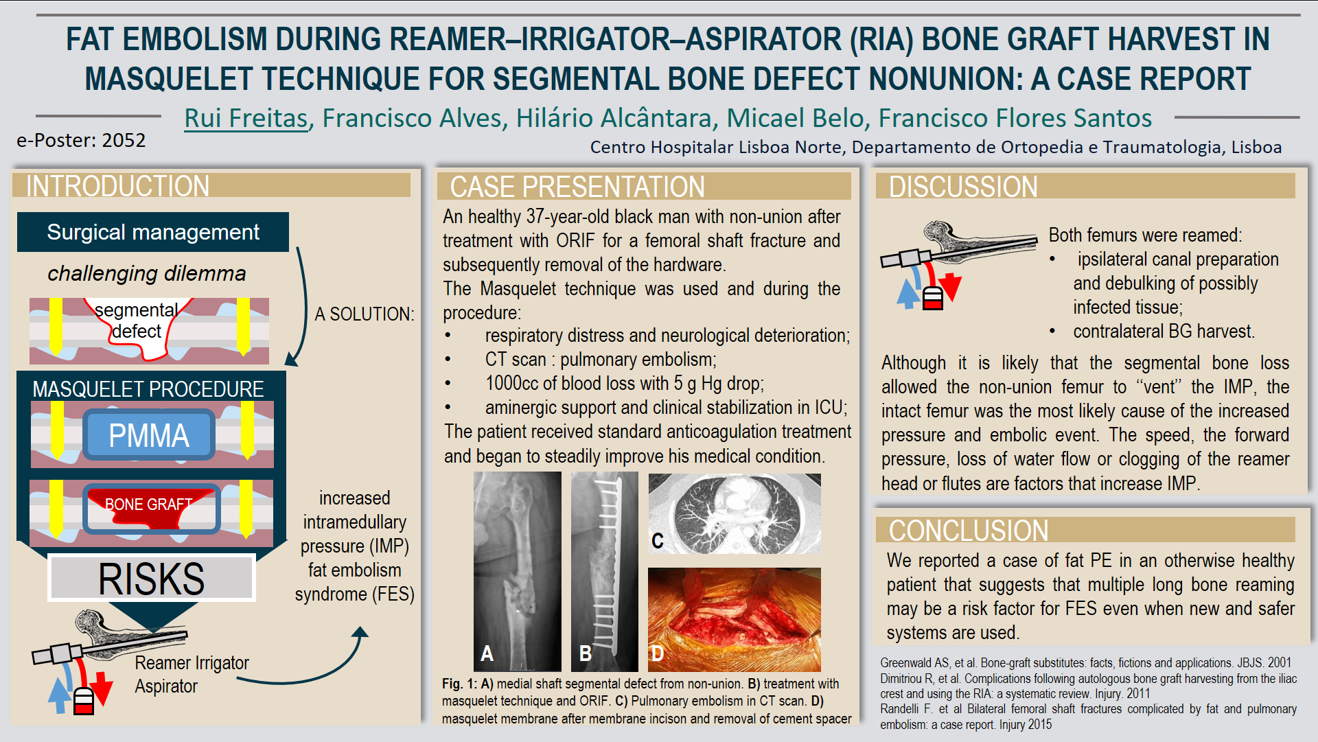 Background: Surgical management of long bone segmental defects is a challenging dilemma. One option is the Masquelet procedure which uses autologous bone graft (BG). Recently, the use of a reamer, irrigator, aspirator (RIA) system has gained popularity for harvesting BG but raises concerns related to increased intramedullary pressure (IMP) and potentially fatal fat embolism syndrome (FES). Case Presentation: An otherwise healthy 37-year-old black man presented to our Institution with non-union after treatment with ORIF for a femoral shaft fracture and subsequently removal of the hardware. The Masquelet technique was used, this included sequentially reaming of both femurs using the RIA system. During this process, the patient developed respiratory distress and neurological deterioration. Results of a CT scan revealed a pulmonary embolism. The patient received standard anticoagulation treatment and began to steadily improve his medical condition. Discussion: The RIA was used for IM canal preparation, debulking of possibly infected tissue in the non-united femur, and BG harvest of the contralateral femur. Although it is likely that the segmental bone loss allowed the non-union femur to ‘‘vent’’ the IMP, the intact femur was the most likely cause of the increased pressure and embolic event. The speed, the forward pressure, loss of water flow or clogging of the reamer head or flutes are factors that increase IMP. We reported a case of fat PE in an otherwise healthy patient that suggests that multiple long bone reaming may be a risk factor for FES even when new and safer systems are used.
