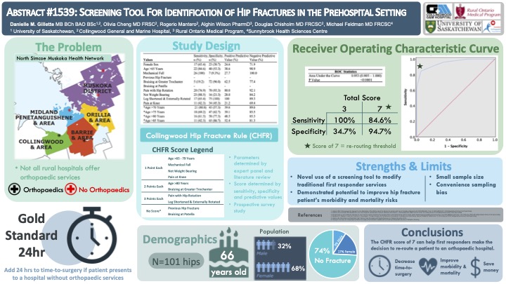 Methods: Literature and expert opinion defined parameters for the Collingwood Hip Fracture Rule (CHFR) which predict a patient’s likelihood of hip fracture. The study population included adults presenting to Collingwood General and Marine Hospital (CGMH) with lower extremity injuries between December 1st, 2019–March 10th, 2020. Excluded patients had previous hip replacement, hip fracture on the side of the injury, or a high energy mechanism of injury. Patients were assessed with the CHFR before receiving x-ray imaging. The parameters were scored based on their predictive powers and analysed by a Receiver Operating Characteristic (ROC) curve.