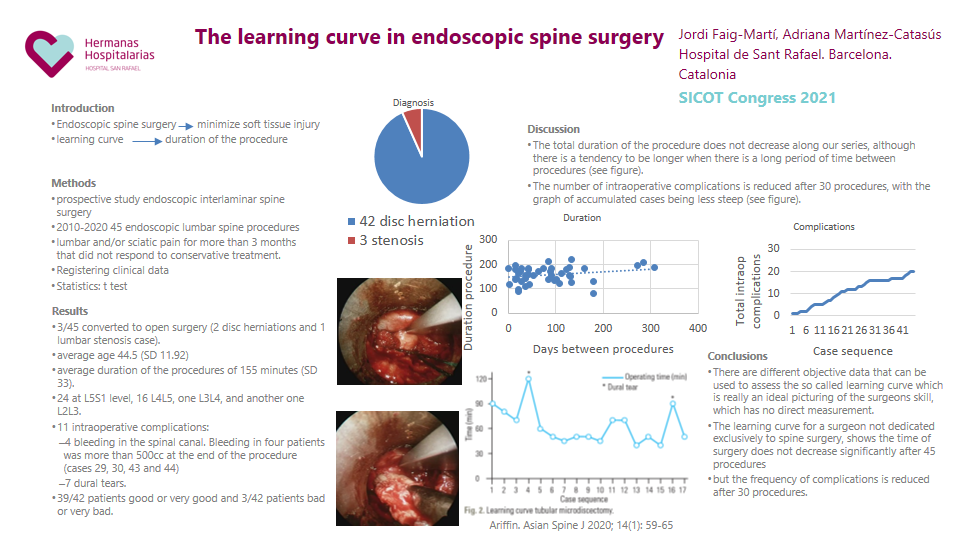 Introduction: Endoscopic spine surgery aims to minimize soft tissue injury during the procedures. In general, the duration of the procedure is used to draw the learning curve but other variables can be used. Methods: We have studied our own learning curve in endoscopic interlaminar spine surgery assessing duration of surgery, blood loss, complications, Oswestry Disability Index (ODI), and pain. From 2010 to 2020 we performed 45 endoscopic lumbar spine procedures, three of which had to be converted to open surgery in two disc herniations and in a lumbar stenosis case (cases 3, 4 and 45). Results: In the remaining series of 42, the patients’ average age was 44.5 (SD 11.92) with an average duration of the procedures of 155 minutes (SD 33). 24 procedures were at L5S1 level, 16 L4L5, one L3L4, and another one L2L3. In this series we had 11 intraoperative complications (4 bleeding in the spinal canal and 7 dural tears). Bleeding in four patients was more than 500cc at the end of the procedure (cases 29, 30, 43 and 44). 39 patients considered the final result as good or very good, and 3 patients as bad or very bad. Discussion: The total duration of the procedure does not decrease along our series, although there is a tendency to be longer when there is a long period of time between procedures. The number of intraoperative complications is reduced after 30 procedures, with the graph of accumulated cases being less steep.