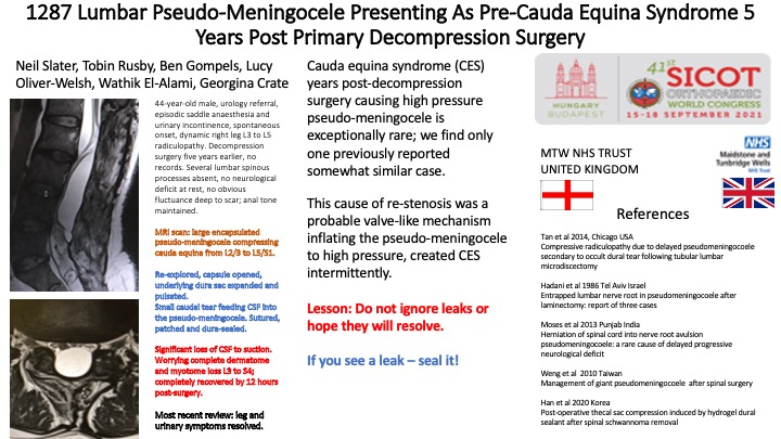 Cauda equina syndrome (CES) years post-decompression surgery caused by a high pressure pseudo-meningocele is exceptionally rare; we find only one previously reported somewhat similar case. A 44-year-old male was referred from Urology with episodic saddle anaesthesia and urinary incontinence of spontaneous onset plus dynamic right leg L3 to L5 radiculopathy. Spinal decompression surgery five years earlier had achieved a good result, but no records were available. There was absence of several lumbar spinous processes to palpation, no neurological deficit at rest and no obvious fluctuance deep to the scar; anal tone was maintained. MRI scan revealed a large, encapsulated pseudo-meningocele compressing the cauda equina from L2/3 to L5/S1. At re-exploration the pseudo-meningocele capsule was opened and the underlying dura sac was seen to expand and pulsate. A small caudal tear in the dura was feeding CSF into the pseudo-meningocele inflating it episodically. It sealed with fine sutures, patching and dura-seal. Significant amounts of CSF were lost to suction. In recovery worrying complete dermatome and myotome loss was complained of bilaterally from L3 to S4; completely recovered by 12 hours post-surgery. At recent review leg and urinary symptoms had resolved. This cause of re-stenosis is exceptionally rare. We speculate a valve mechanism operated to inflate the pseudo-meningocele to high pressure and create CES intermittently. Whatever the cause of CES, surgical management – adequate removal of compressing elements without destabilising the spine – is the same; identified CSF leaks must be sealed and patches and sealants are helpful adjuncts to simple suture.