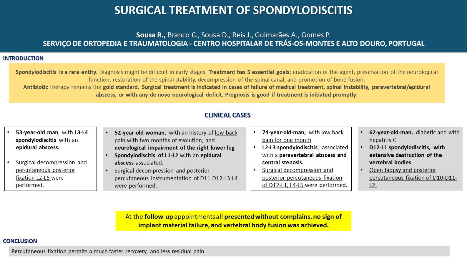 Spondylodiscitis is a rare entity. Diagnosis might be difficult in early stages. Treatment has 5 essential goals: eradication of the agent, preservation of the neurological function, restoration of the spinal stability, decompression of the spinal canal, and promotion of bone fusion. Antibiotic therapy remains the gold standard. Surgical treatment is indicated in cases of failure of medical treatment, spinal instability, paravertebral/epidural abscess, or with any de novo neurological deficit. Prognosis is good if treatment is initiated promptly.