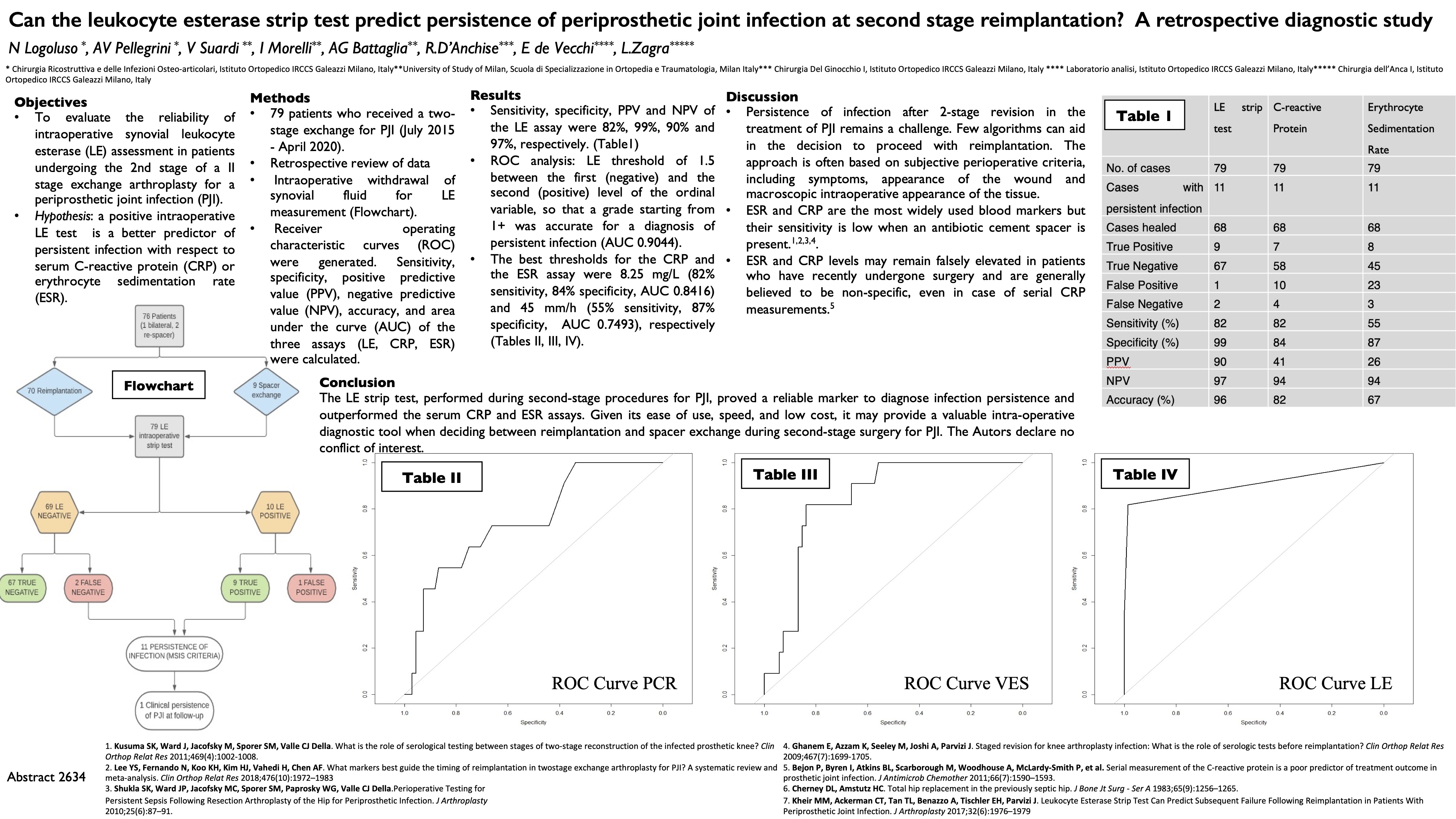with this study we evaluated the reliability of intraoperative assessment of leukocyte esterase (LE) in synovial fluid samples from patients undergoing reimplantation following implant removal and spacer insertion for periprosthetic joint infection (PJI). Our hypothesis was that an intraoperative LE strip test could be a better predictor of persistent infection than either serum C-reactive protein (CRP) or erythrocyte sedimentation rate (ESR). 76 patients (47 men and 29 women) received a two-stage exchange for PJI between July 2015 and April 2020. Synovial fluid was collected before arthrotomy for LE measurement by means of enzymatic colorimetric strips. Receiver operating characteristic curves (ROC) were generated. Sensitivity, specificity, positive predictive value (PPV), negative predictive value (NPV), accuracy, and area under the curve (AUC) of the three assays (LE, CRP, ESR) were calculated. the sensitivity and the specificity of the LE assay was 82% and 99%, respectively; the PPV and the NPV was 90% and 97%, respectively. ROC analysis revealed a LE threshold of 1.5, so that a grade starting from 1+ was accurate for a diagnosis of persistent infection The best thresholds for the CRP and the ESR assay were 0.825 mg/dL (82% sensitivity, 84% specificity, AUC 0.8416) and 45 mm/h (55% sensitivity, 87% specificity, AUC 0.7493), respectively. the LE strip test, when performed during second-stage procedures for PJI, proved a reliable marker to diagnose persistence of infection and outperformed the serum CRP and ESR assays. The strip test provides a valuable intraoperative diagnostic tool when deciding between reimplantation and spacer exchange.