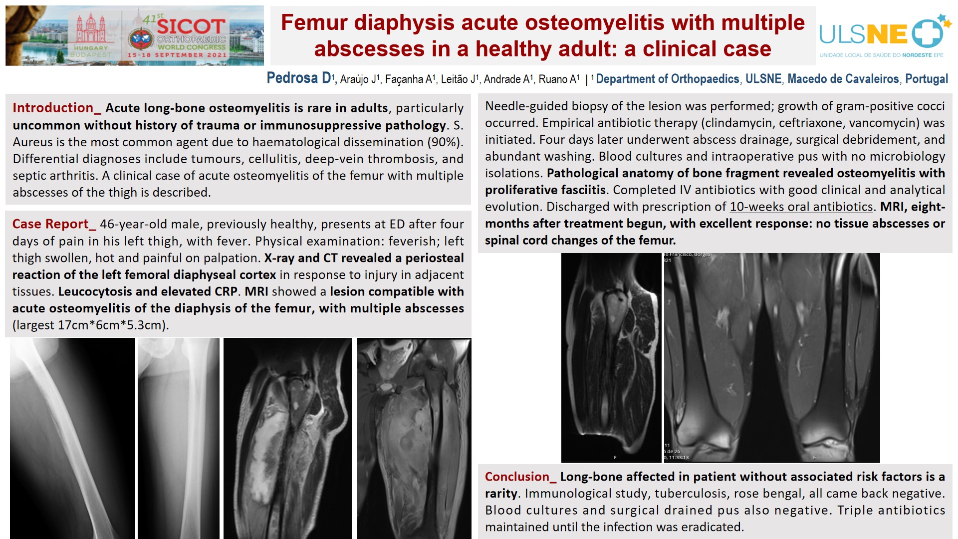 Introduction: Acute long-bone osteomyelitis is rare in adults, particularly uncommon without history of trauma or immunosuppressive pathology. S. Aureus is the most common agent due to haematological dissemination (90%). Differential diagnoses include tumours, cellulitis, deep-vein thrombosis, and septic arthritis. A clinical case of acute osteomyelitis of the femur with multiple abscesses of the thigh is described. Case Report: 46-year-old male, previously healthy, presents at ED after four days of pain in his left thigh, with fever. Physical examination: feverish; left thigh swollen, hot and painful on palpation. X-ray and CT revealed a periosteal reaction of the left femoral diaphyseal cortex in response to injury in adjacent tissues. Leucocytosis and elevated CRP. MRI showed a lesion compatible with acute osteomyelitis of the diaphysis of the femur, with multiple abscesses (largest 17cm*6cm*5.3cm). Needle-guided biopsy of the lesion was performed; growth of gram-positive cocci occurred. Empirical antibiotic therapy (clindamycin, ceftriaxone, vancomycin) was initiated. Four days later underwent abscess drainage, surgical debridement, and abundant washing. Blood cultures and intraoperative pus with no microbiology isolations. Pathological anatomy of bone fragment revealed osteomyelitis with proliferative fasciitis. Completed IV antibiotics with good clinical and analytical evolution. Discharged with prescription of 10-weeks oral antibiotics. MRI, eight-months after treatment begun, with excellent response: no tissue abscesses or spinal cord changes of the femur. Conclusion: Long-bone affected in patient without associated risk factors is a rarity. Immunological study, tuberculosis, rose bengal, all came negative. Negative blood cultures and surgical drained pus. Triple antibiotics maintained until the infection was eradicated.