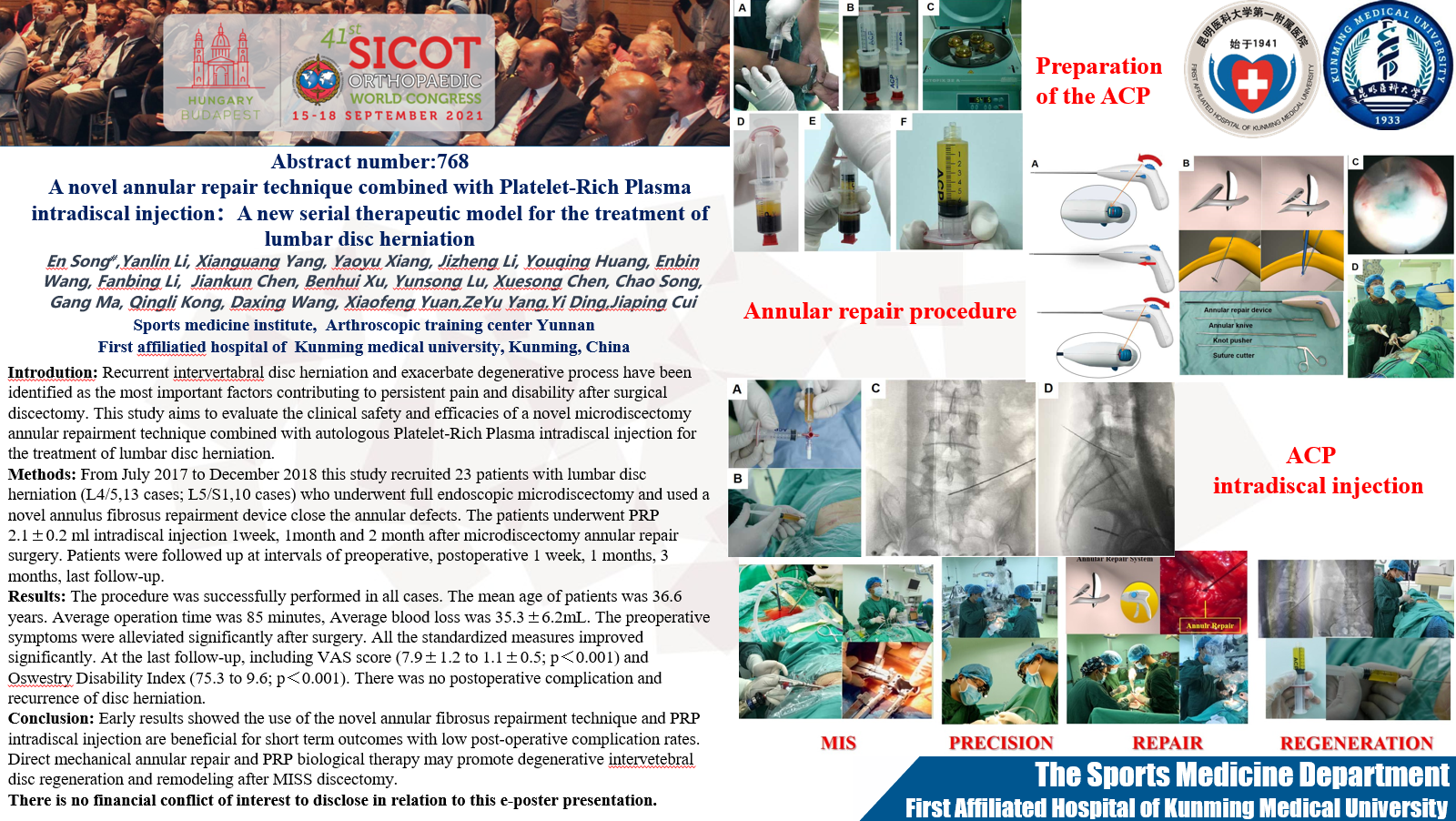 Introduction:This study aims to evaluate the clinical safety and efficacies of a novel microdiscectomy annular repairment technique combined with autologous Platelet-Rich Plasma intradiscal injection for the treatment of lumbar disc herniation.Methods: From July 2018 to December 2019 this study recruited 18 patients with lumbar disc herniation who underwent tubular microdiscectomy and used a novel annulus fibrosus repairment device close the annular defects which was an automatic stitching and tying device.The patients underwent A-PRP 2.1±0.2 ml intradiscal injection 1week, 1month and 2 month after microdiscectomy annular repair surgery. The pre/post-operation neurological function and pain status were evaluated by VAS and ODI.The assessment also data including: operation time, the quantity of bleeding and intraoperative and postoperative complications, were recorded. Patients were followed up at intervals of preoperative, postoperative 1 week, 1 months, 3 months, last follow-up. Results:The procedure was successfully performed in all cases. Average operation time was 85 minutes, Average blood loss was 35.3±6.2mL. The preoperative symptoms were alleviated significantly after surgery. All the standardized measures improved significantly. At the last follow-up, including VAS score (7.9±1.2 to 1.1±0.5; p<0.001) and ODI (75.3 to 9.6; p<0.001). There was no postoperative complication and disc reherniation.Conclusion:Early results showed the use of the novel annular fibrosus repairment technique and PRP intradiscal injection are beneficial for short term outcomes demonstrating reduction in symptomatic disc reherniation with low post-operative complication rates. Direct mechanical annular repair and A-PRP biological therapy may promote degenerative intervertebral disc regeneration after MISS discectomy.