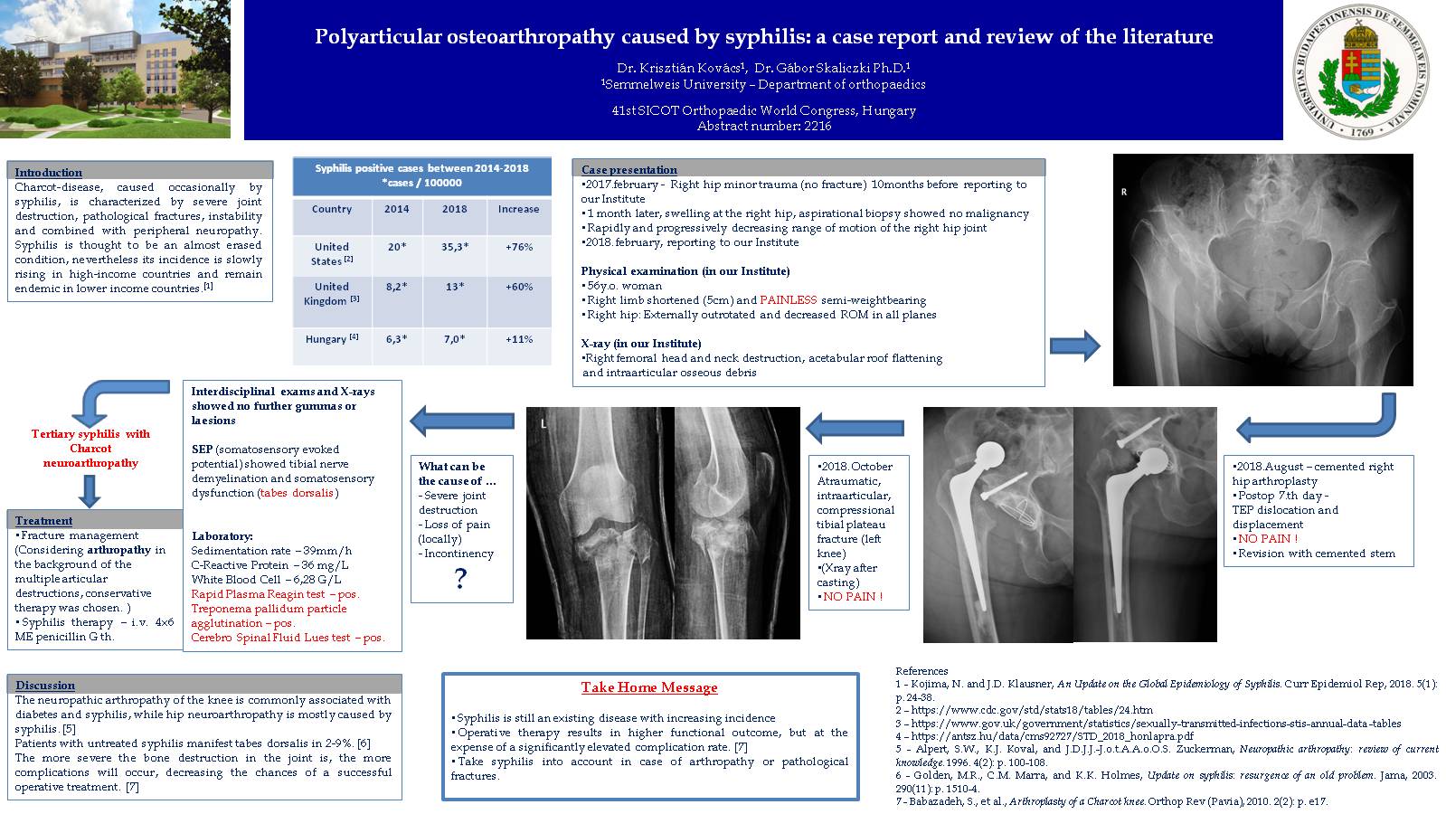 Charcot-disease, caused occasionally by syphilis, is characterized by severe joint destruction, pathological fractures, instability and combined with peripheral neuropathy. Syphilis is thought to be an almost erased condition, nevertheless its incidence is slowly rising according to recent statistics. The authors present the case of a patient with neuroarthropathy affecting the hip and knee joints. Due to the different occurrence of the disease, surgical treatment was performed in the hip, while the two months later an atraumatic, pathological intraarticular knee joint fracture occurred, which was treated conservatively. The therapy of the affected joints were challenging, but finally both were healing with satisfying results, despite the current suboptimal healing patterns. The literature mentions several therapy methods, but our final, considered choice was the conservative management. A review of the corresponding literature highlighting the pathophysiology and management of the disease is also given, next to the aim to plant suspicion in the surgeon's mind in case of meeting with arthropathy.