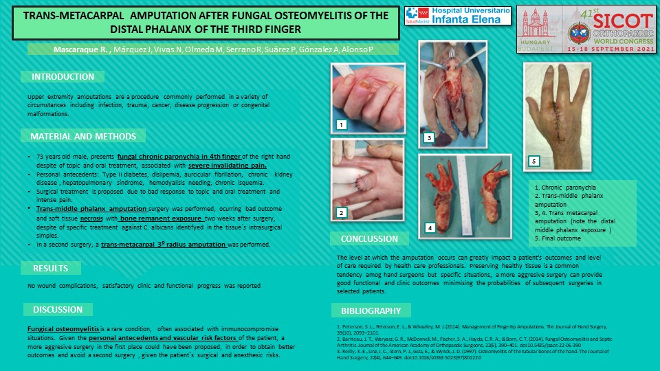 Introduction: Upper extremity amputations are a procedure commonly done in a variety of circumstances including infection, trauma, cancer, etc. Methods: 73 years old male with personal pathological antecedents of type II diabetes, chronic kidney disease with hemodialysis needing, and hepatopulmonary syndrome who presents fungal chronic paronychia in 4th finger of the right hand despite of topic and oral treatment, associated with severe invalidating pain. Imaging tests diagnosed distal phalanx osteomielitis. Surgical treatment is proposed due to bad response to topic and oral treatment and intense pain. Trans-middle phalanx amputation surgery was performed, ocurring bad outcome and soft tissue necrosis with exposure of the bone remanent two weeks after surgery, despite of specific treatment against C. albicans identifyed in the tissue´s intrasurgical simples. In a second surgery, a trans-metacarpal 3º radius amputation was performed. Results: No wound complications, satisfactory clinic and functional progress was reported. Discussion: Fungical osteomyelitis is a rare condition, often associated with immunocompromise situations.Given the personal antecedents and vascular risk factors of the patient, a more aggresive surgery in the first place could have been proposed, in order to obtain better outcomes and avoid a second surgery , given the patient´s surgical and anesthesic risks. Conclussions: The level at which the amputation occurs can greatly impact a patient's outcomes and level of care required by health care professionals. Preserving healthy tissue is a common tendency amog hand surgeons but specific situations, a more aggresive surgery can provide good functional and clinic outcomes minimising the probabilities of subsequent surgeries.