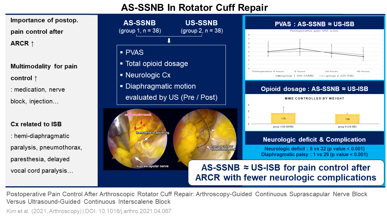 Purpose: We aimed to compare the clinical efficacy and safety of arthroscopy-guided continuous suprascapular nerve block (AS-SSNB) and ultrasound-guided continuous interscalene block (US-ISB) in patients who underwent arthroscopic rotator cuff repair (ARCR).