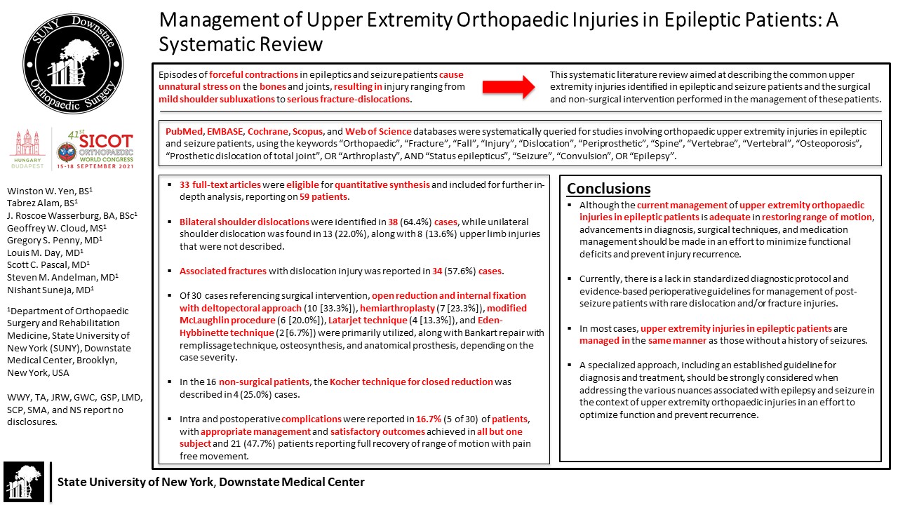 Introduction: Our goal was to perform a systematic review to find literature identifying common upper extremity injuries in epileptic and seizure patients and appropriate surgical and non-surgical management of injuries in these patients. Methods: The search engines PubMed, EMBASE, Cochrane, and Web of Science were systematically screened using predefined search terms. Articles not written in English and animal studies were excluded. Those discussing upper-extremity orthopaedic injuries in epileptic patients were selected. Results: Of 108,825 articles, 29 met the inclusion criteria. One article discussed increased morbidity and mortality for in-hospital epileptic patients undergoing total joint arthroplasty. All remaining 28 discussed common injuries almost exclusively found in epileptic and seizure patients compared to the general population. Two predominant injuries were discussed (posterior shoulder dislocation with/without fracture [19 articles; 65.5%] and anterior shoulder dislocation with/without fracture, [10 articles; 34.5%]). Of the 19 posterior shoulder articles, 10 (52.6%) referenced surgical techniques, while the remaining 8 articles used varied specific approaches depending on the case severity. There were 5/10 articles discussing surgical techniques in anterior shoulder injuries, the most common of which included the modified Latarjet technique and open reduction and internal fixation (each, 2 articles). Conclusion: Post-seizure patients may require unique consideration to accurately identify injuries and a standardized diagnostic protocol is necessary to ensure these injuries are diagnosed and managed accordingly. They may also need a specialized approach to treatment that accommodates the nuances of their condition.