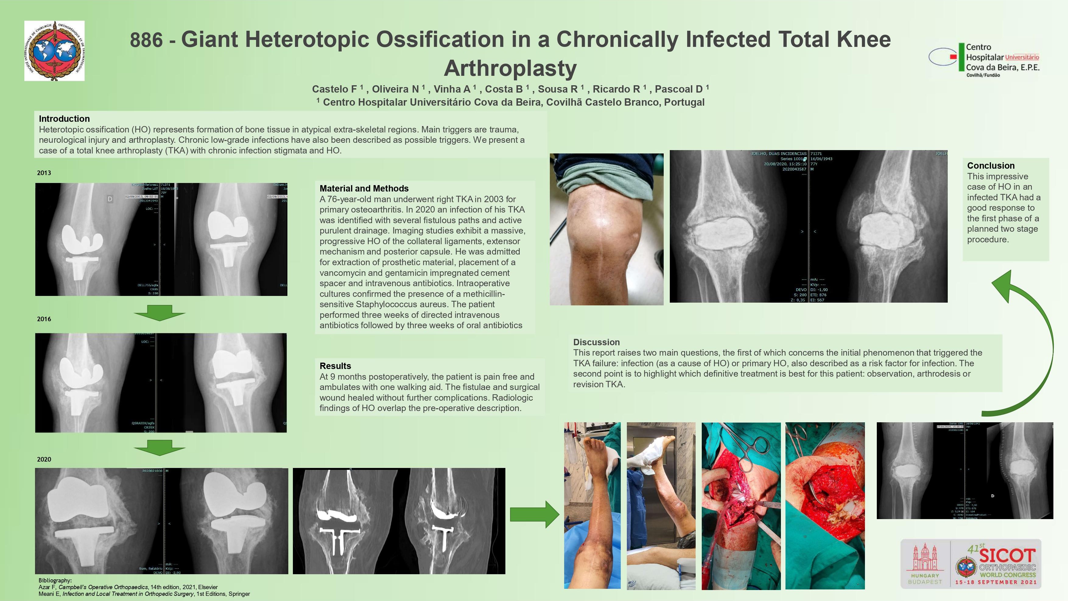 Heterotopic ossification (HO) represents formation of bone tissue in atypical extra-skeletal regions. Main triggers are trauma, neurological injury and arthroplasty. Chronic low-grade infections have also been described as possible triggers. We present a case of a total knee arthroplasty (TKA) with chronic infection stigmata and HO. A 76-year-old man underwent right TKA in 2003 for primary osteoarthritis. In 2020 an infection of his TKA was identified with several fistulous paths and active purulent drainage. Imaging studies exhibit a massive, progressive HO of the collateral ligaments, extensor mechanism and posterior capsule. He was admitted for extraction of prosthetic material, placement of a vancomycin and gentamicin impregnated cement spacer and intravenous antibiotics. Intraoperative cultures confirmed the presence of a methicillin-sensitive Staphylococcus aureus. The patient performed three weeks of directed intravenous antibiotics followed by three weeks of oral antibiotics. At 9 months postoperatively, the patient is pain free and ambulates with one walking aid. The fistulae and surgical wound healed without further complications. Radiologic findings of HO overlap the pre-operative description. This report raises two main questions, the first of which concerns the initial phenomenon that triggered the TKA failure: infection (as a cause of HO) or primary HO, also described as a risk factor for infection. The second point is to highlight which definitive treatment is best for this patient: observation, arthrodesis or revision TKA. This impressive case of HO in an infected TKA had a good response to the first phase of a planned two stage procedure.