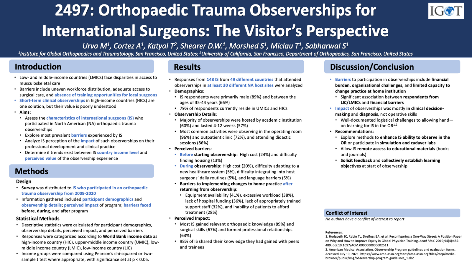 Introduction: International observerships are one of many efforts aimed at addressing disparities in orthopaedic trauma care globally. However, their impact on visiting surgeons and their home countries, as well as the challenges faced by participating surgeons, are not well-documented. Methods: A survey was distributed to overseas surgeons who participated in an orthopaedic trauma observership in North America from 2009-2020. Information gathered included the participant’s demographics and observership details; perceived impact of the program; and barriers faced before, during, and after the program. Results: 724 surveys were initially distributed, with 223 respondents, and 142 complete responses from 46 countries. Most observerships lasted either 4 weeks or less (65%) or 5-12 weeks (27%), and were sponsored by an academic institution (60%) or professional society (32%). Most observers felt that they gained relevant orthopaedic knowledge (91%) and surgical skills (68%), and nearly all (98.9%) shared this knowledge with their colleagues and trainees. Cost (85%) and housing (56%) were the most common barriers to participants before beginning their observership. During the observership, the most common barriers included cost (84%) and adapting to a new healthcare system (54%). After returning from their observership, the most common barriers to implementing changes to their practice were lack of funding (72%), equipment (78%), support staff (77%), and excessive workload (86%). Discussion: Participating in a North American orthopaedic trauma observership positively impacts the surgical and clinical skills of most visiting surgeons. However, financial constraints, resource limitations, and limited logistical support present barriers to maximizing this potential.