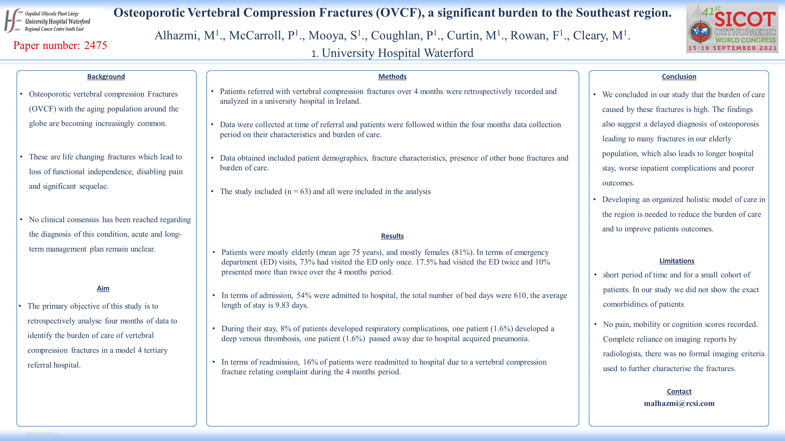 Results: Data from 63 patients were analyzed. Patients were mostly elderly (mean age 75 years). 73% had visited the ED only once. 17.5% had visited the ED twice. 10% presented more than twice over a 120-day period. 54% were admitted to hospital, the total number of bed days was 610, the average LOS is 9.83 days. 16% of patients were readmitted to hospital due to a VCF relating complaint within 120 days. 30% of patients had appropriate orthogeriatric bloods performed at the time of referral. 95% of patients had plain radiographs. 115 x-rays in total were performed within 120 days of referral. 54% of patients had CT scans at time of referral. 20% of patients had MRI scans performed.