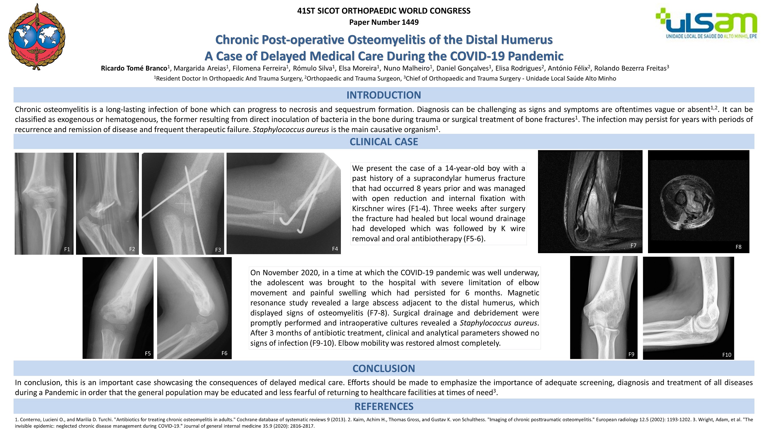 Chronic osteomyelitis is a long-lasting infection of bone which can progress to necrosis and sequestrum formation. Diagnosis can be challenging as signs and symptoms are oftentimes vague or absent. It can be classified as exogenous or hematogenous, the former resulting from direct inoculation of bacteria in the bone during trauma or surgical treatment of bone fractures. The infection may persist for years with periods of recurrence and remission of disease and frequent therapeutic failure. Staphylococcus aureus is the main causative organism. We present the case of a 14-year-old boy with a past history of a supracondylar humerus fracture that had occurred 8 years prior and was managed with open reduction and internal fixation with Kirschner wires. Three weeks after surgery the fracture had healed but local wound drainage had developed which was followed by Kirschner wire removal and oral antibiotherapy. On November 2020, in a time at which the COVID-19 pandemic was well underway, the adolescent was brought to the hospital with severe limitation of elbow movement and painful swelling which had persisted for 6 months. Magnetic resonance study revealed a large abscess adjacent to the distal humerus, which displayed signs of osteomyelitis. Surgical drainage and debridement were promptly performed and intraoperative cultures revealed a Staphilococcus aureus. After 3 months of antibiotic treatment, clinical and analytical parameters showed no signs of infection. Elbow mobility was restored almost completely.
