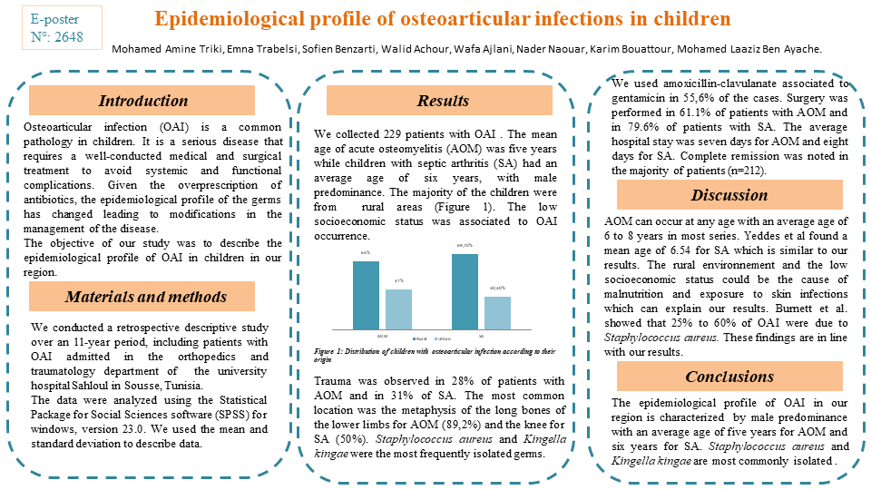 The objective of our study was to describe the epidemiological profile of osteoarticular infections in children in our region.