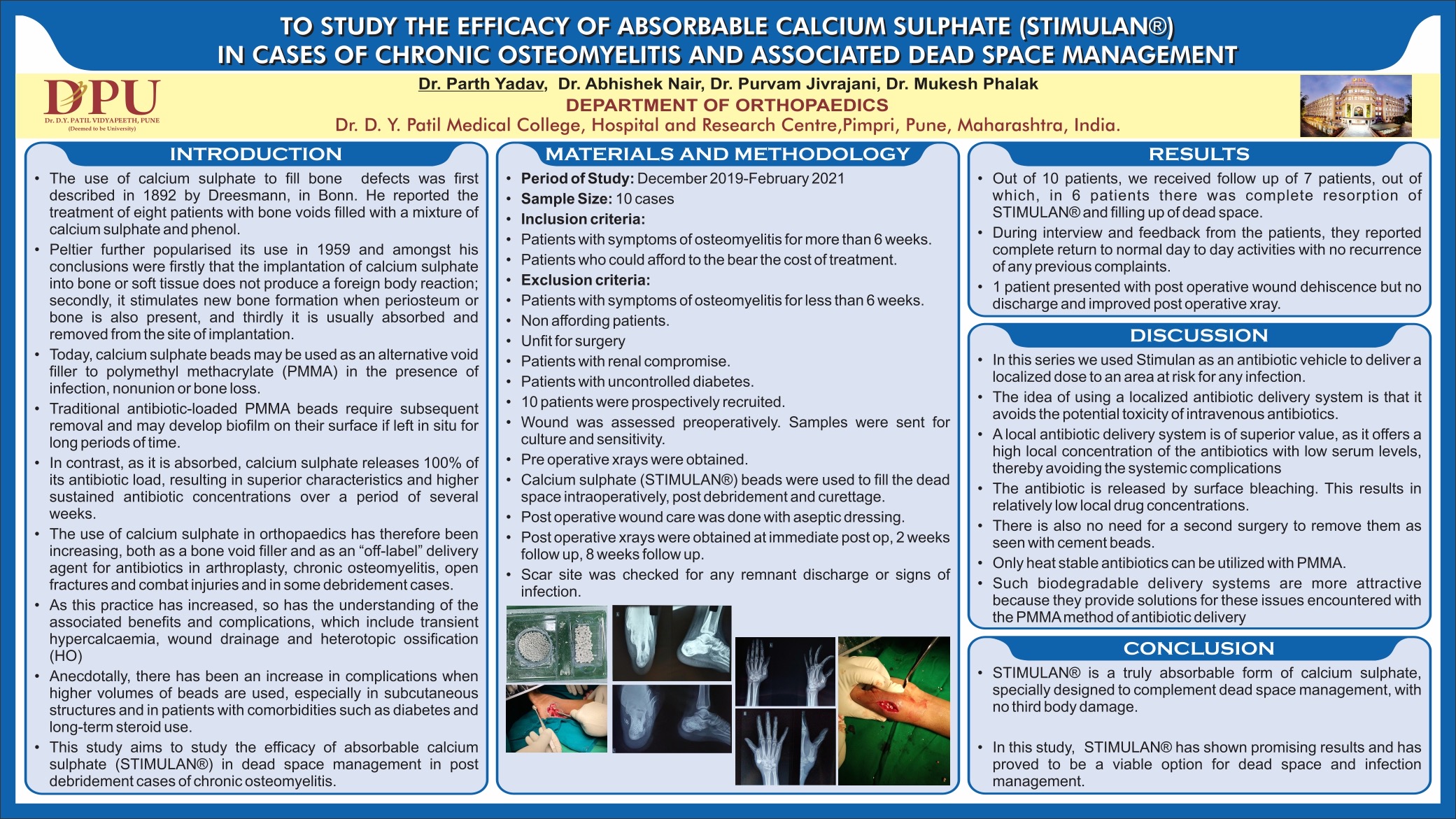 Results: Out of 10 patients, we received follow up of 7 patients, out of which, in 6 patients there was complete resorption of STIMULAN® and filling up of dead space as confirmed on follow up X rays. During interview and feedback from the patients, they reported complete return to normal day to day activities with no recurrence of any previous complaints. 1 patient presented with post operative wound dehiscence but no discharge and improved post operative xray.