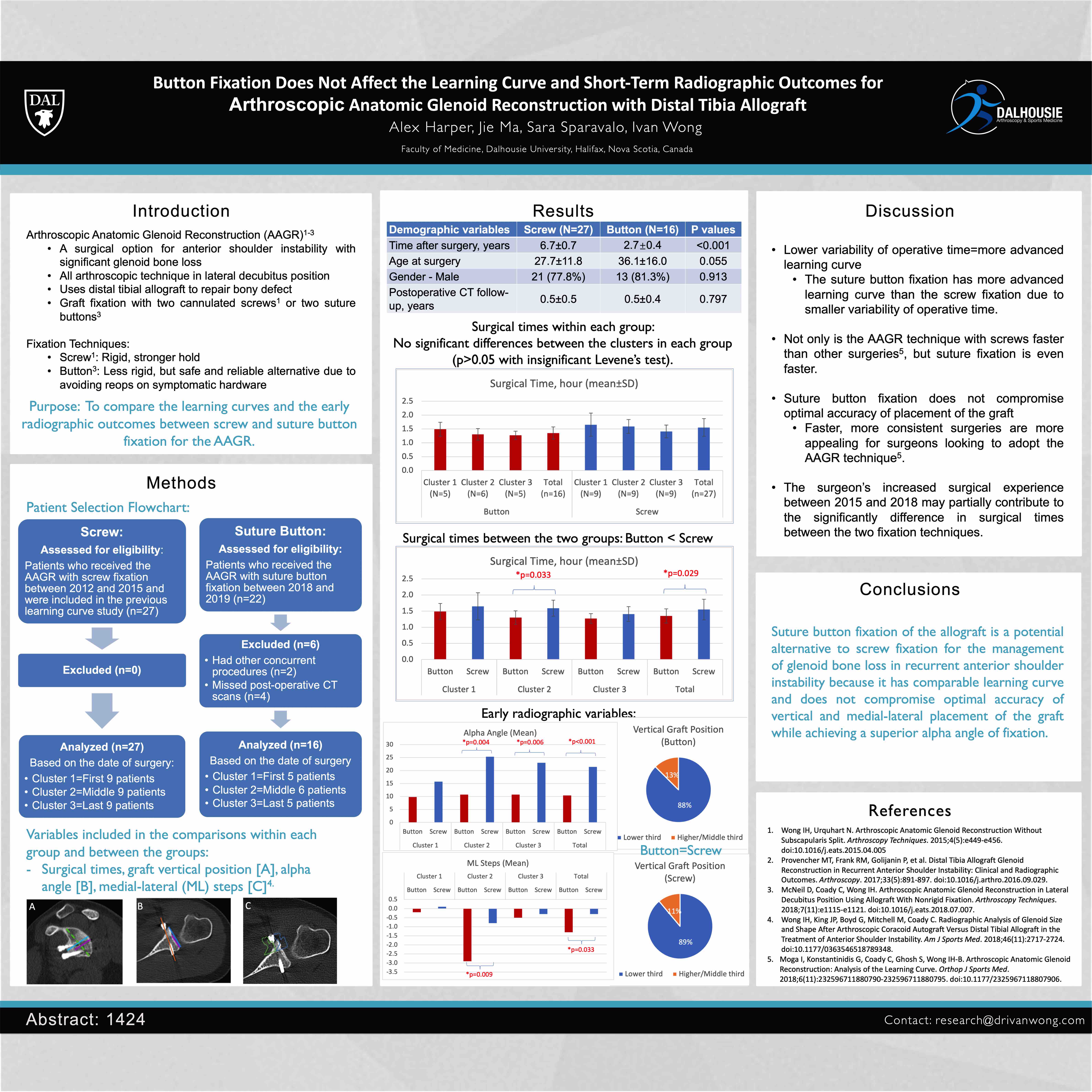 Arthroscopic anatomic glenoid reconstruction (AAGR) using tibial allograft is a technique used to treat recurrent anterior shoulder instability with bone loss. The original technique used screw fixation and more recently, a technique has been described using button fixation. The purpose of this study was to compare the learning curve and graft positioning of the two fixation types. We performed a retrospective review on AAGR patients with button fixation (2018-2020). These patients were compared to the first set of patients who received AAGR with screw fixation (2015-2018). All patients received AAGR from the senior author and had a short-term post-operative CT. Exclusion criteria included patients with rotator cuff pathology, multidirectional instability and fractures. Surgical times and post-operative graft positioning were compared between the two groups. There were 43 patients (Screw:27; Button: 16) who met the inclusion/exclusion criteria. The average operative time for the button and screw fixation groups were 1.35±0.22 and 1.55±0.32 hours, respectively. The button group showed a significant reduction in operative time compared to the screw group (p=0.029). The graft positioning for both groups was on the lower third (button:n=14; screw:n=24) and middle third (button:n=2; screw:n=3) with no significant difference between the groups (p=0.891). Button fixation results in good horizontal positioning with respect to medial-lateral step formation, with slightly better positioning being achieved using screw fixation (p=0.033). AAGR has a short learning curve regardless of fixation type, with button fixation resulting in a shorter operations. The surgical times for both fixation types are comparable to existing arthroscopic stabilization techniques.