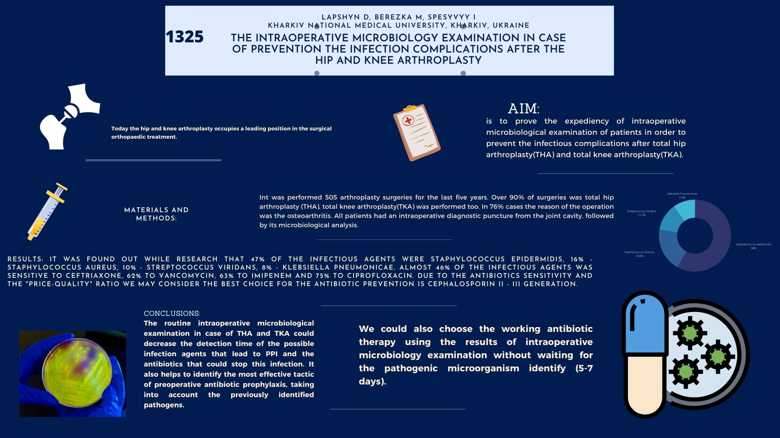 Aim: The optimization of the ways to prevent infectious complications after arthroplasty surgeries by using the intraoperative microbiology examination of the patient. Materials and methods: It was performed 505 arthroplasty surgeries for the last five years in Kharkiv regional hospital that meant more than 100 surgeries per year. Mostly it was performed total hip arthroplasty. In 76% cases the reason of the operation was the osteoarthrosis. In 18% of patients the reason was bone fracture and in 6% it was the hip displasia. It was performed microbiology examination of the joints in all cases with analyzing it. Results: 47% of infectious agents was Staphylococcus Epidermidis, 16% – Staphylococcus Aureus, 10% – Streptococcus Viridans, 8% – Klebsiella Pneumoniae. It should also be noted that the titer of microorganisms that were found was less than 100, except the Staphylococcus Epidermidis, which concentration was 100000. It has been revealed that infectious agents in more than 50% of cases are susceptible to levofloxacin, cefoperazone, vancomycin, imipenem, amikacin, and 75% to ciprofloxacin. Conclusions: The intraoperative microbiology examination allows to decrease the diagnosing time of infectious agents that could occur and to choose the proper antibiotics therapy if it is necessary. It also allows to find out the most effective antibiotic for the the prevention of infectious complication after the arthroplasty in the hospital where surgeries are performed in.