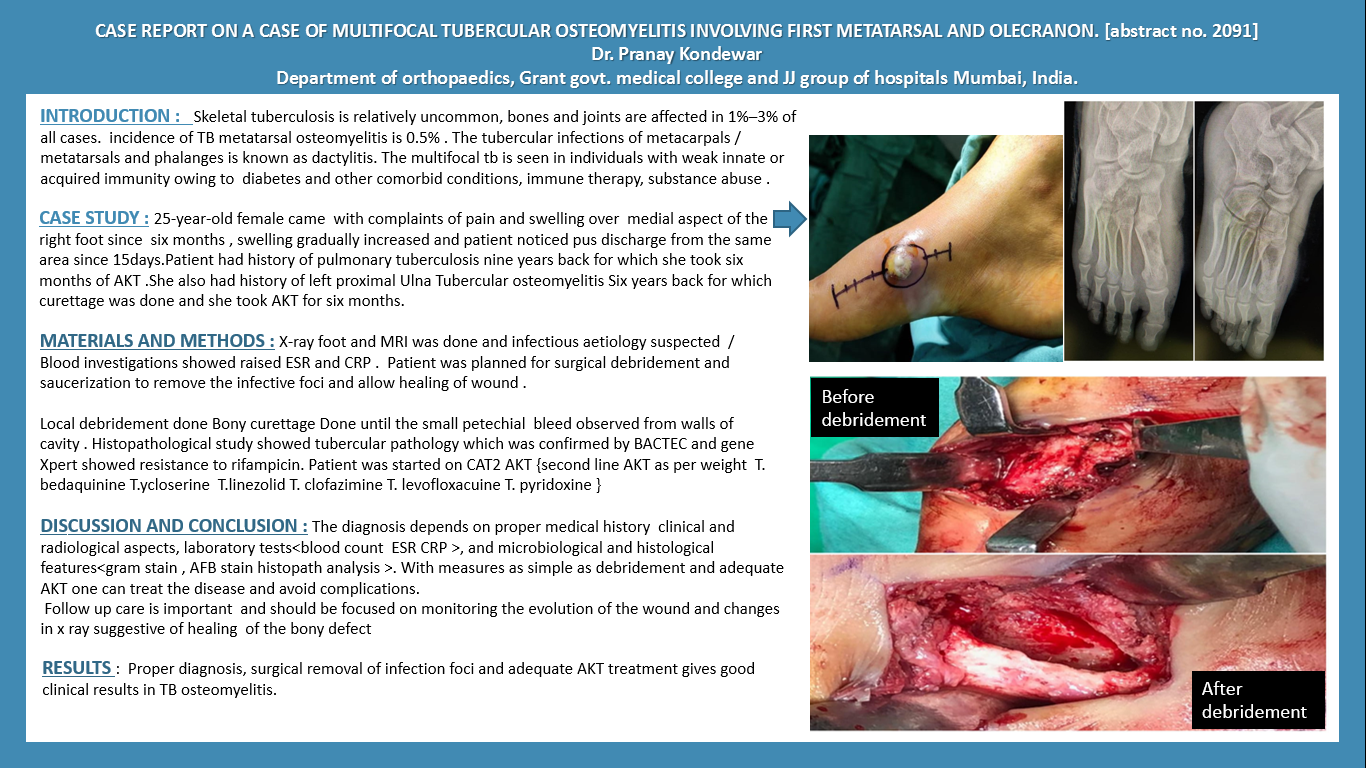 Skeletal tuberculosis is uncommon compared to pulmonary form of tuberculosis .literature suggests incidence of <0.5% for metatarsal dactylitis .osteoarticular tuberculosis affects weight-bearing joints, non-weightbearing joints affected by tuberculosis, such as elbow, are not frequently reported in literature. mode of spread is bacillemia via blood.CASE REPORT 25-year-old female came with complaints of pain ,swelling over medial aspect of right foot since 6 months . patient noticed pus since 20 days On examination Wound of 1cm size present Over metatarsal head Past history Patient had history of pulmonary tuberculosis nine years back for which she took [AKT]anti kochs therapy.She also had history of olecranon Tubercular osteomyelitis six years back for which curretage was done by us. x-ray and CT scan foot was done ESR ,CRP increased .SURGERY Local wound debridement ,Bony curretage Done until small petecheal bleed observed from bone ,wash given And Skin sutured.microscopic examination along with Gene xpert Showed multidrug resistant tuberculosis Patient was started on{second line akt as per weight T.bedaquinine T.cycloserine T.linezolid T.clofazimine T.levofloxacuine T. pyridoxine }after 30 days postop patients wound completely healed.Followup X-ray suggested filling of the defect created by the curretage Currently patient is walking and on AKT DISCUSSION clinical manifestation consists of pain, swelling or chronic skin ulcer.radiologically osteoporosis, bone expansion with reactive sclerosis, reduced joint space,progressive destruction of joint with cystic expansion of short tubular bones named spina ventosa. CONCLUSION metatarsal and olecranon involvement is very rare entity With measures as simple as debridement and adequate Anti tubercular drugs one can treat disease.