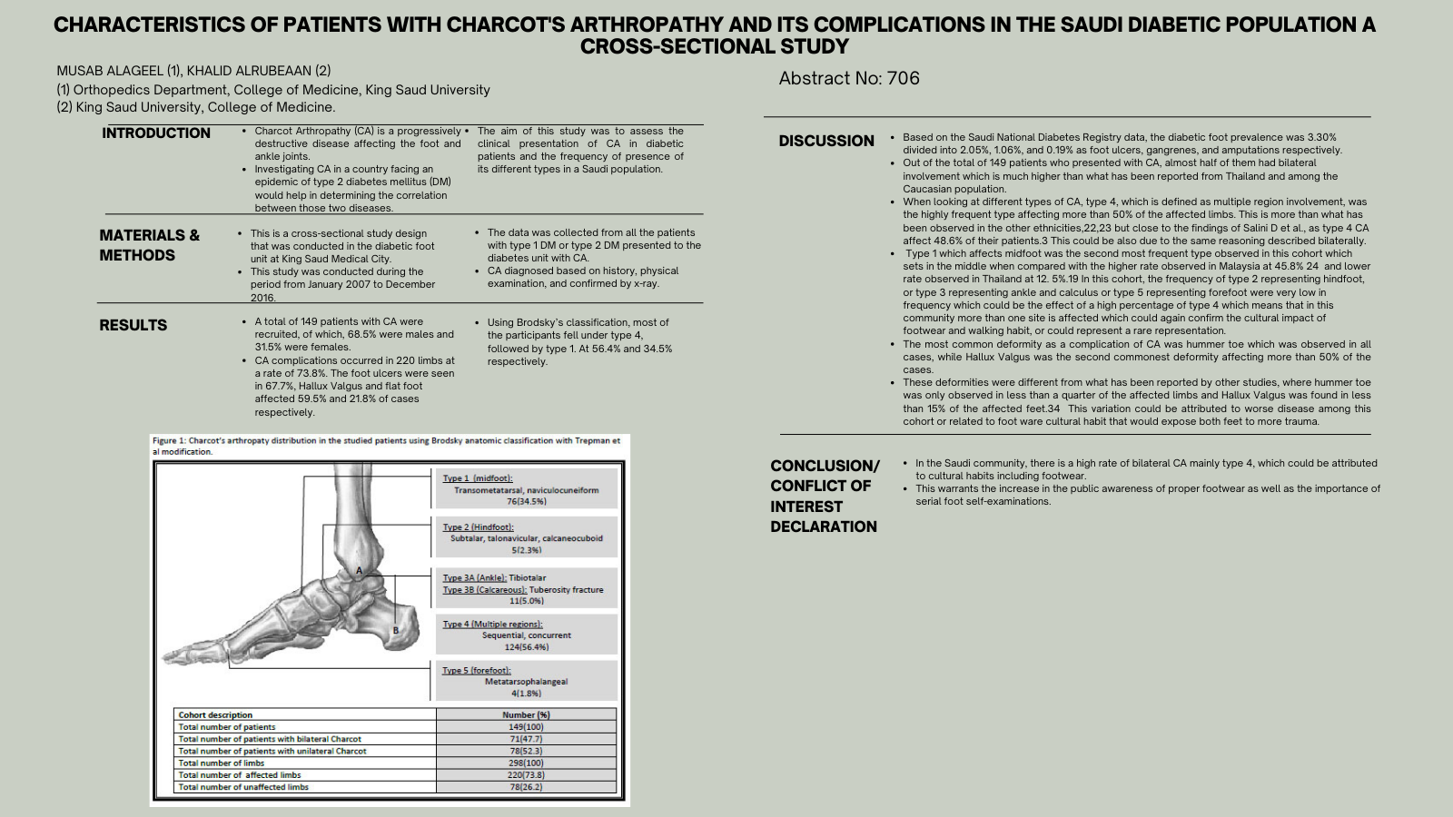 Background Charcot's arthropathy (CA) is a destructive rare complication of diabetes, and its diagnosis remains challenging for foot specialists and surgeons. We aimed to assess the clinical presentation and characteristics of CA and the frequencies of its various types. Methods This cross-sectional study was conducted from January 1, 2007, to December 31, 2016, and included 149 adults with diabetes diagnosed as having CA. Cases of CA were classified based on the Brodsky anatomical classification into five types according to location and involved joints. Results The mean ± SD age of the studied cohort was 56.7 ± 11 years, with a mean ± SD diabetes duration of 21.2 ± 7.0 years. The CA cohort had poorly controlled diabetes and a high rate of neuropathy and retinopathy. The most frequent type of CA was type 4, with multiple regions involved at a rate of 56.4%, followed by type 1, with midfoot involvement at 34.5%. A total of 47.7% of the patients had bilateral CA. Complications affected 220 limbs, of which 67.7% had foot ulceration. With respect to foot deformity, hammertoe affected all of the patients; hallux valgus, 59.5%; and flatfoot, 21.8%. Conclusions There is a high rate of bilateral CA, mainly type 4, which could be attributed to cultural habits in Saudi Arabia, including footwear. This finding warrants increasing awareness of the importance of maintaining proper footwear to avoid such complications. Implementation of preventive measures for CA is urgently needed.