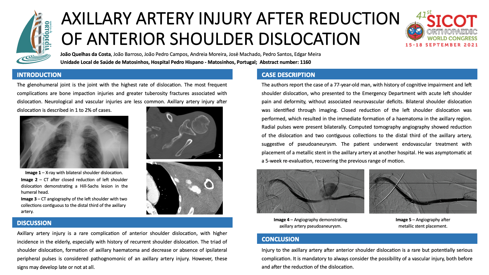 Case description: The authors report the case of a 77-year-old man, with history of cognitive impairment and bilateral shoulder dislocation at different times, who presented to the Emergency Department with acute left shoulder pain and deformity, without associated neurovascular deficits. Bilateral shoulder dislocation was identified through imaging. Closed reduction of the left shoulder dislocation was performed, which resulted in the immediate formation of a haematoma in the axillary region. Radial pulses were present bilaterally. Computed tomography angiography showed reduction of the dislocation and two collections contiguous to the distal third of the axillary artery, suggestive of pseudoaneurysm. The patient underwent endovascular treatment with placement of a metallic stent in the axillary artery. He was asymptomatic at a 5-week re-evaluation, recovering the previous range of motion.