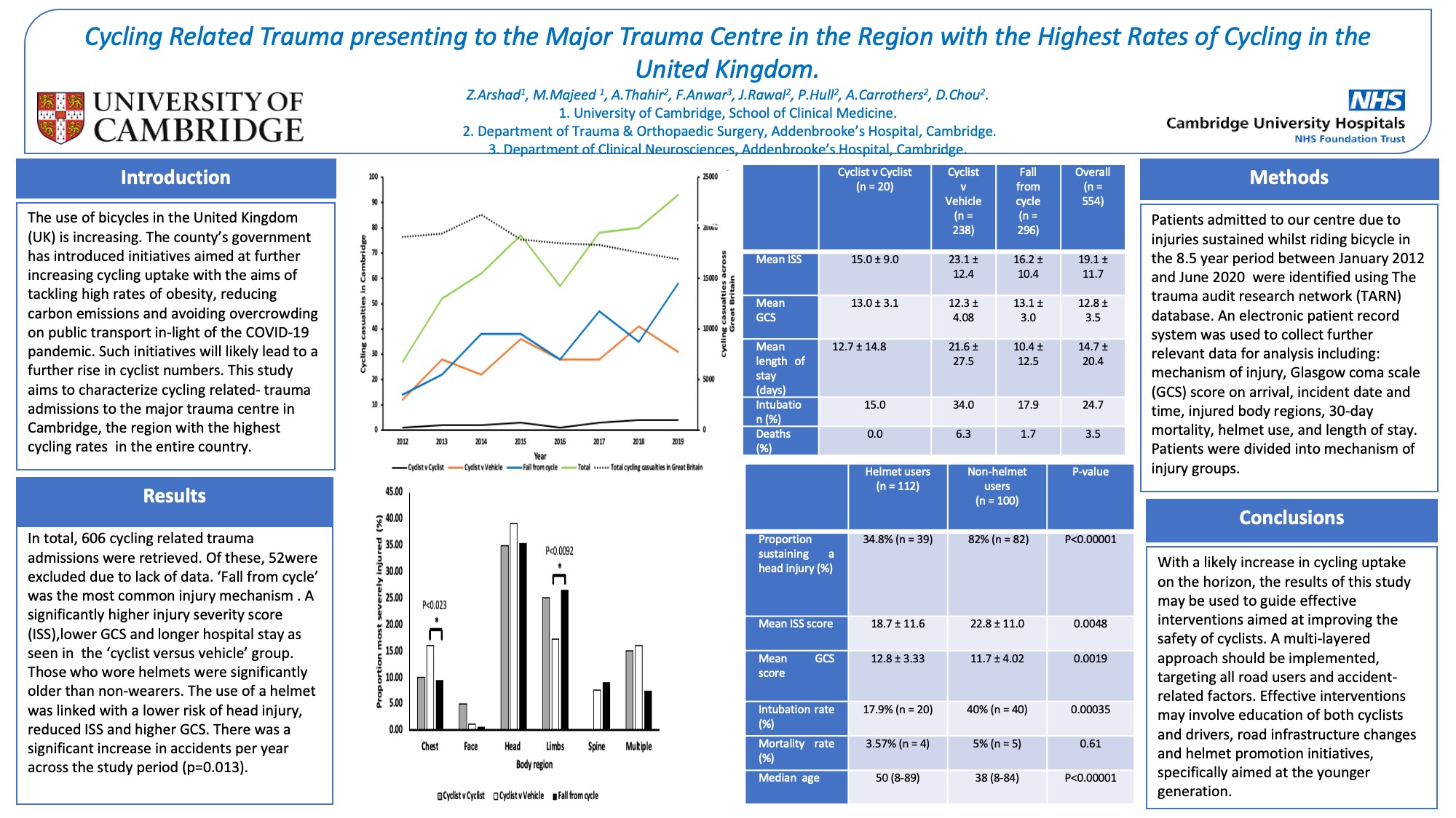Introduction: With the recent launch, by the United Kingdom Government (UK), of a campaign aimed at promoting cycling uptake, the use of cycles in the country is likely to increase. This study aims to characterise cycling related injuries sustained in Cambridgeshire, the region with the highest rates of cycling in the UK. Methods: A retrospective review of cycling related trauma admissions between January 2012 - June 2020 was performed. Our centre's electronic record system was used to collect data including: age, gender, injury mechanism,injured body regions, incident date, helmet use, Glasgow coma scale (GCS), length of stay and 30-day mortality. Comparison was made between different injury mechanisms: 'fall from cycle', 'cyclist versus vehicle' and 'cycle v cycle'. Results: A total of 606 cycling-related trauma cases were identified, with 52 excluded due to insufficient data. 'Fall from cycle' was he most common mechanism (53.4%). The ‘cyclist v vehicle’ group was associated with a significantly lower GCS, higher Injury Severity score (ISS) and longer hospital stay than the other two groups. Patients wearing a helmet during the accident showed a significantly reduced risk of head injury, lower ISS and higher GCS. A significantly increased age was seen in helmet wearers, compared to non-wearers. Discussion: With a likely increase in cycling uptake, it is crucial that effective accident prevention interventions are implemented. Our findings may be used to guide such interventions. A holistic strategy involving road infrastructure changes, driver and cyclist education and helmet promotion campaigns targeting the younger generation could be employed.
