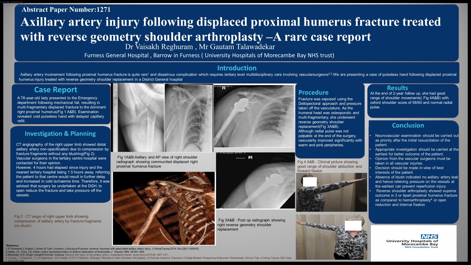 A 78-year-old lady presented to the Emergency department following mechanical fall, resulting in multi-fragmentary displaced fracture to the dominant right proximal humerus. Examination revealed cold pulseless hand with delayed capillary refill. CT angiography of the right upper limb showed distal axillary artery non-opacification due to compression by fracture fragments without any blushing. Vascular surgeons in the tertiary centre hospital were contacted for their opinion. However, 4 hours had elapsed since injury and the nearest tertiary hospital being 1.5 hours away, referring the patient to that centre would result in further delay and increased cold ischaemia time. Therefore, it was advised that surgery be undertaken at the DGH, to open reduce the fracture and take pressure off the vessels. Fracture was exposed using the Deltopectoral approach and pressure taken off the vasculature. As the humeral head was osteoporotic and multi-fragmentary, she underwent reverse geometry shoulder replacement. Although radial pulse was not palpable at the end of the surgery, vascularity improved significantly with warm and pink peripheries. At the end of 2-year follow up, she had good range of shoulder movements with oxford shoulder score of 58/60 and normal radial pulse.