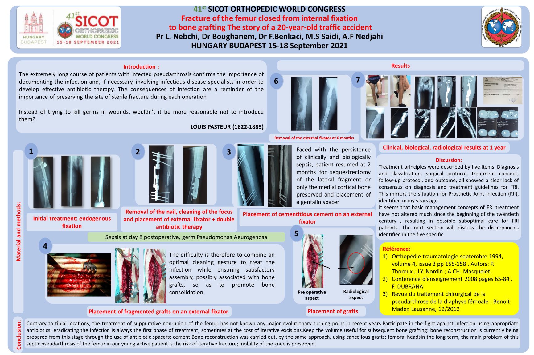 This Study includes a young patient, treated over 2014-2016, for septic nonunion of the femur, according to a standardised technique implemented in two stages; first healing of the infection and stabilisation, followed by bone reconstruction after a precautionary period.The minimum duration of antibiotic treatment was 8 weeks.The principal objective of the medico-surgical management over a two year period was defined as the healing of the infection and radiological assessment of bone consolidation with the lower limb intact. There were four surgical interventions with our reconstruction technique, involving compacted graft fragments followed by the arrest of sepsis then followed by consolidation.We had to use the scanner to refine the radiological analysis of cortical continuity.It was thought that the problem of diaphyseal nonunion was addressed by the arrival of bone inductors but the published results are disappointing to a greater or lesser degree.Because of that, thanks to our results, fragmented allografts remain for us the solution which brings the three essential factors to the consolidation linked to a rigorous management of the treatment which is necessary more than ever .