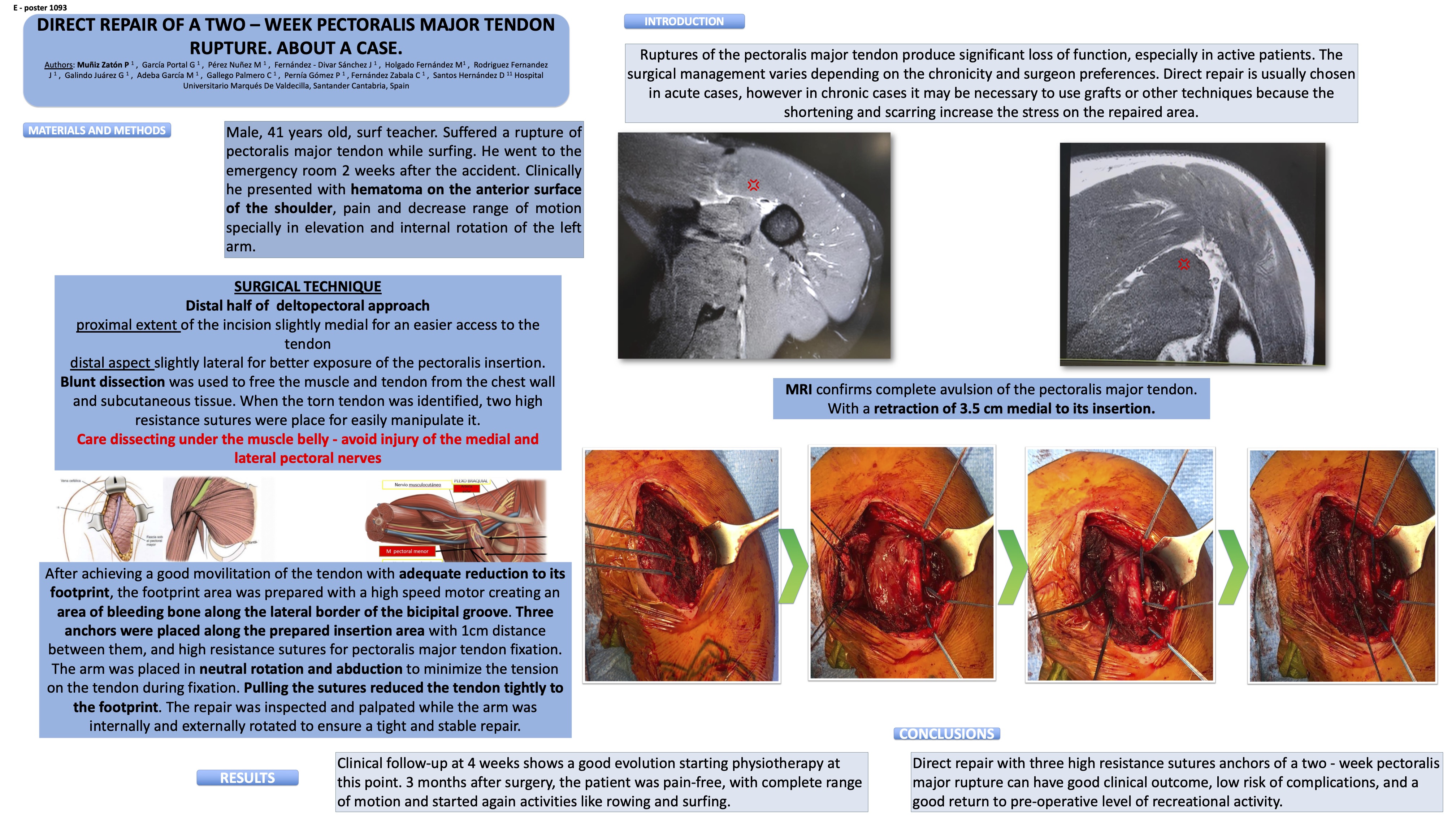 Background: Surgical management of Ruptures of the pectoralis major tendon varies depending on the chronicity and surgeon preferences. Direct repair is usually chosen in acute cases, however in chronic cases it may be necessary to use other techniques. Case Presentation: Male, 41 years old, surf teacher. Suffered a rupture of pectoralis major tendon while surfing. He went to the emergency room 2 weeks after the accident. Clinically he presented with hematoma on the anterior surface of the shoulder, pain and decrease range of motion specially in elevation and internal rotation of the left arm. MRI confirms complete avulsion of the pectoralis major tendon. With a retraction of 3.5 cm medial to its insertion. Surgical technique: Distal half of a deltopectoral approach was performed. A blunt dissection was used to free the muscle and tendon from the chest wall and subcutaneous tissue. The footprint area was prepared creating an area of bleeding bone along the lateral border of the bicipital groove. Three anchors were placed and high resistance sutures for pectoralis major tendon fixation. Pulling the sutures reduced the tendon tightly to the footprint. Clinical Outcomes: Clinical follow-up at 4 weeks shows a good evolution. 3 months after surgery, the patient was pain-free, with complete range of motion and started again activities. Discussion: Direct repair with high resistance sutures anchors of a two - week pectoralis major rupture can have good clinical outcome, low risk of complications, and a good return to pre-operative level of recreational activity.
