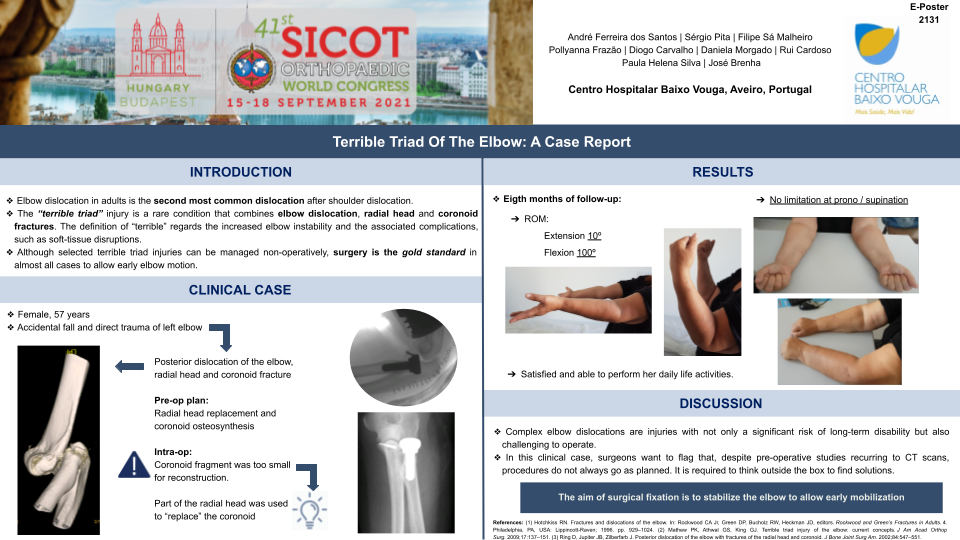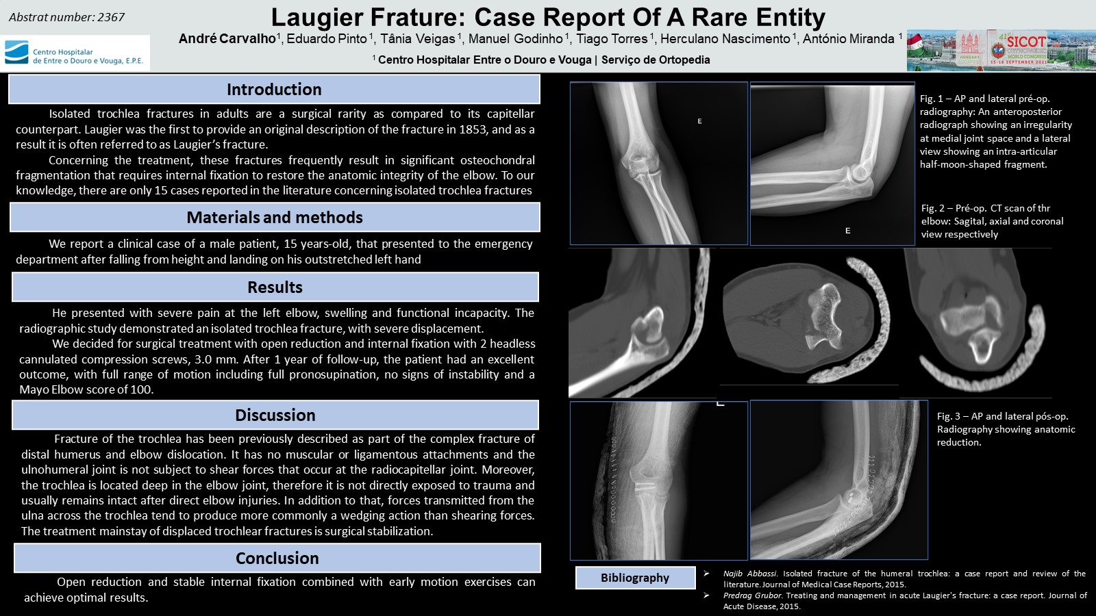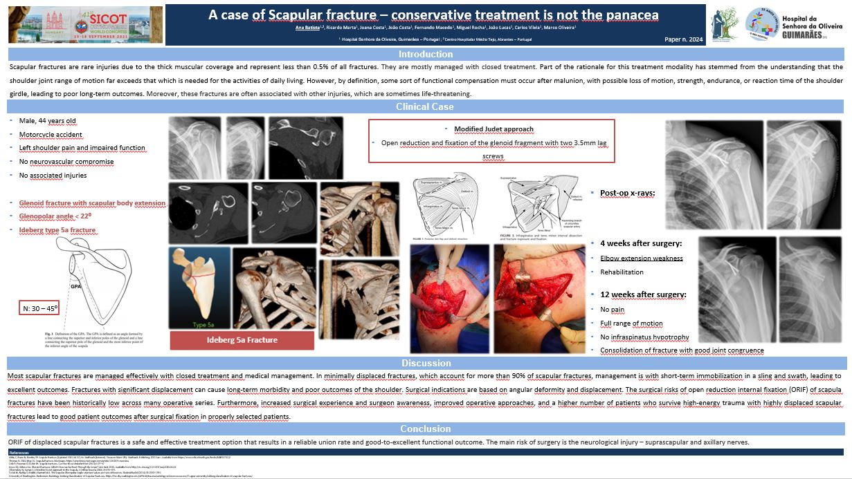 Scapular fractures are rare injuries due to the thick muscular coverage and represent less than 0.5% of all fractures. They are mostly managed with closed treatment. Some with significant displacement have poor long-term outcomes for the shoulder and the upper extremity as a whole if treated with closed techniques. These fractures are often associated with other injuries, which are sometimes life-threatening. Clinical case of a glenoid fracture with scapular body extension, documented with images of surgery and radiological study. Male, 44 years-old, presented to the emergency room complaining with left shoulder pain and impaired function after a fall upon left shoulder in a motorcycle accident. No neurovascular impairment. No associated injuries. X-ray and CT revealed a glenoid fracture (glenopolar angle < 22º) with scapular body extension (Ideberg Va). Surgery was performed 2 weeks later – open reduction and fixation of the glenoid fragment with 2 3.5mm lag screws through a modified Judet approach. The body fragments were not significantly displaced. Immobilization in a sling for 3 weeks. He had elbow extension weakness, with complete recovery after rehab at 2 months post-op. 4 months after surgery, he has no pain, full range of motion, no infraspinatus hypotrophy, and signs of fracture consolidation with good joint congruity. Open reduction and internal fixation of displaced scapular fractures is a safe and effective treatment option that results in a reliable union rate and good-to-excellent functional outcome. The main risk of surgery is the neurological injury – suprascapular and axillary nerves.