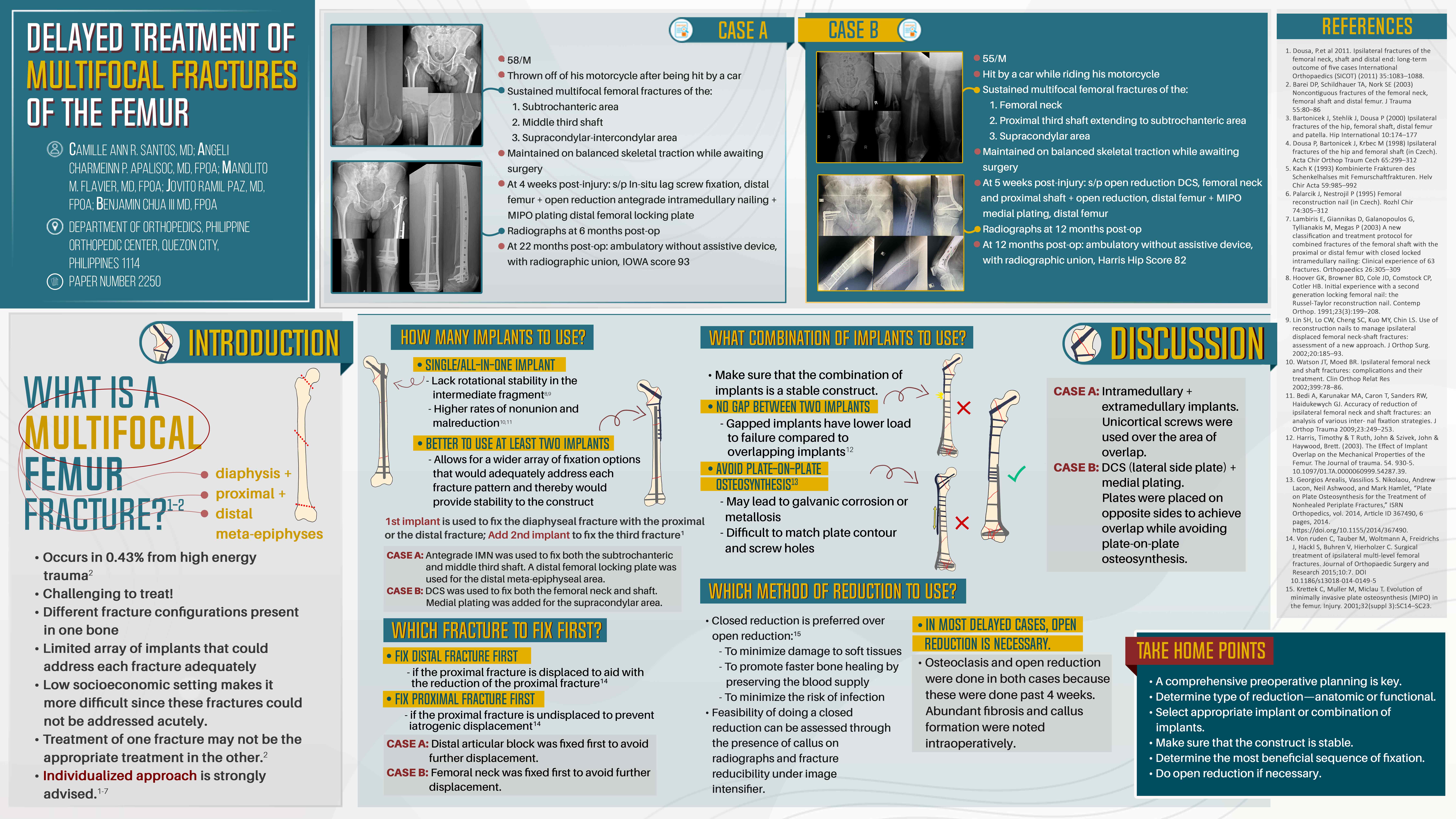 Multifocal femur fractures involve the diaphysis and both the proximal and distal meta-epiphyseal ends of the femur. These fractures are extremely rare occurring in 0.43% of femoral fractures and are challenging to treat due to the different fracture configurations present in one bone and the limited array of implants that could address each fracture component adequately. We present 2 cases of multifocal femoral fractures that were treated successfully through an individualized approach. The first case is a 58-year-old male that was treated at 4 weeks post-injury with lag screw fixation of the distal articular fracture, antegrade intramedullary nailing of the subtrochanter and shaft, and plating of the distal femur. The second case is a 55-year-old male with a 5-week-old injury wherein the femoral neck fracture and the shaft were fixed using a dynamic condylar screw with a 14-hole side plate and the distal fracture was fixed by plating on the medial side through a minimally invasive approach. Follow-up showed stable osteosynthesis with evidence of clinical and radiographic union without postoperative complications. Delayed treatment of multifocal fractures of the femur requires thorough preoperative planning in order to ensure bony union and early mobilization and to prevent catastrophic outcomes. Four questions can be asked as guide in the surgical treatment of these complicated fractures: 1) How many implants to use? 2) which combinations of implant to use? 3) which fracture to fix first? and 4) which method of reduction to use?