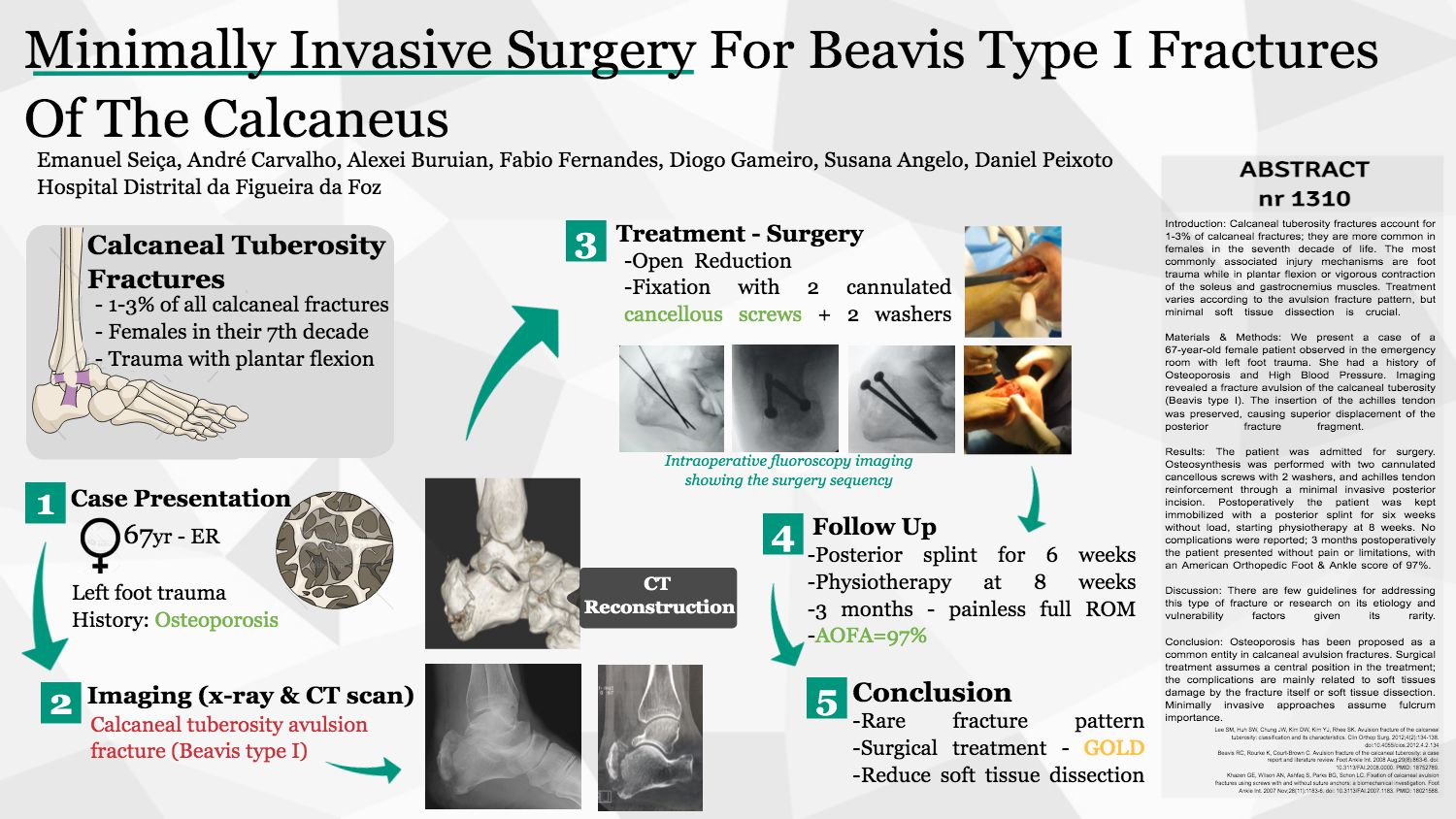 Introduction: Calcaneal tuberosity fractures account for 1-3% of calcaneal fractures; they are more common in females in the seventh decade of life. The most commonly associated injury mechanisms are foot trauma while in plantar flexion or vigorous contraction of the soleus and gastrocnemius muscles. Treatment varies according to the avulsion fracture pattern, but minimal soft tissue dissection is crucial. Case Presentation: We present a case of a 67-year-old female patient observed in the emergency room with left foot trauma. She had a history of Osteoporosis and High Blood Pressure. Imaging revealed a fracture avulsion of the calcaneal tuberosity (Beavis type I). The insertion of the achilles tendon was preserved, causing superior displacement of the posterior fracture fragment. Osteosynthesis was performed with two cannulated cancellous screws with 2 washers, and achilles tendon reinforcement through a minimal invasive posterior incision. Postoperatively the patient was kept immobilized with a posterior splint for six weeks without load, starting physiotherapy at 8 weeks. No complications were reported; 3 months postoperatively the patient presented without pain or limitations, with an American Orthopedic Foot & Ankle score of 97% Conclusion: There are few guidelines for addressing this type of fracture or research on its etiology and vulnerability factors given its rarity. Osteoporosis has been proposed as a common entity in calcaneal avulsion fractures. Surgical treatment assumes a central position in the treatment; the complications are mainly related to soft tissues damage by the fracture itself or soft tissue dissection. Minimally invasive approaches assume fulcrum importance.