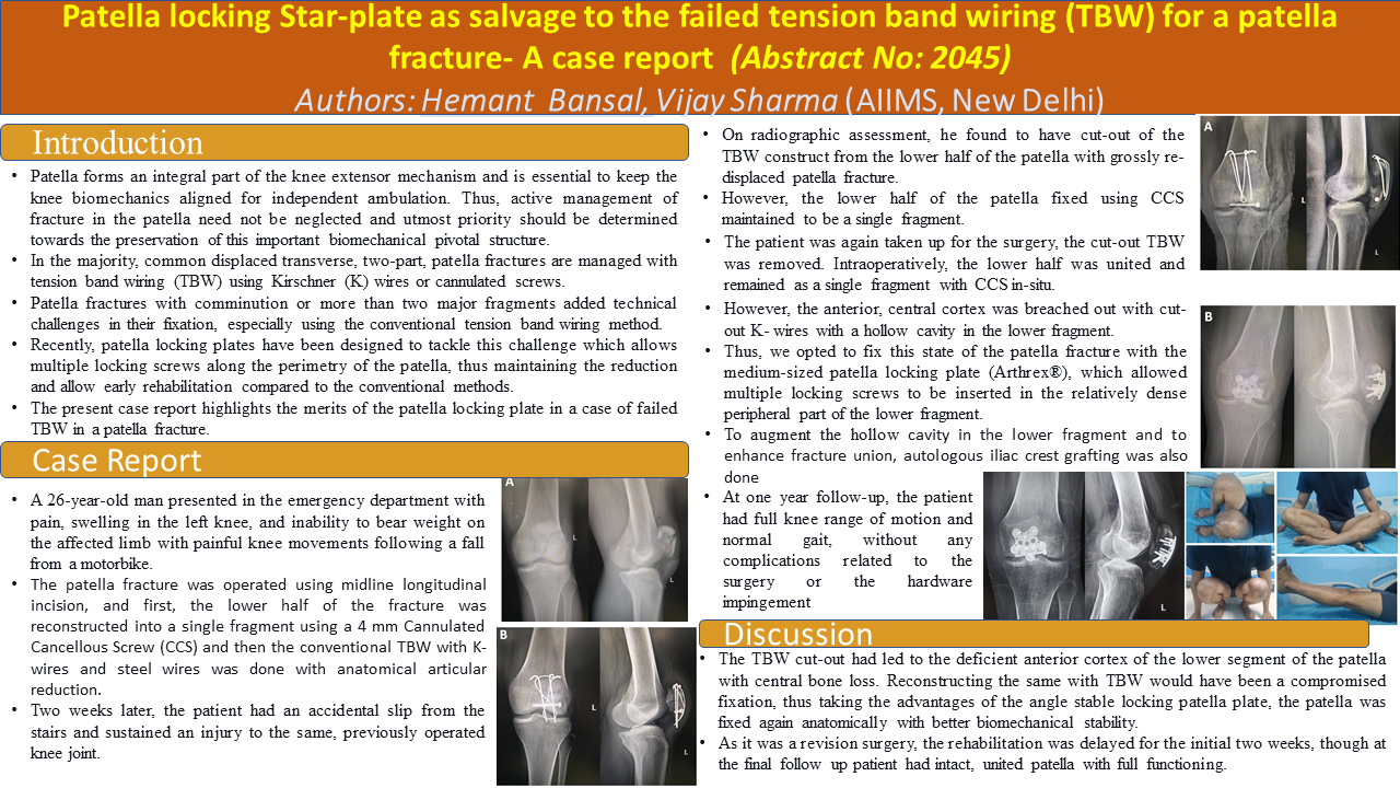 Background: Tension band wiring supposedly is most commonly used technique for displaced patella fractures, but is not effective in comminuted fractures and osteoporotic bones. It often leads to loosening of wires, dislocation of fracture, hardware problem and failure of osteosynthesis resulting in knee stiffness and post-traumatic osteoarthritis. The aim of the study is to evaluate clinical outcome in patients with acute patella fractures(<3 week) treated with unidirectional angle fixed low profile titanium patella locking plate. Materials and Methods : Twenty patients who presented with displaced patella fractures, aged between 18-70 years were included in the study. All fractures were reduced and fixed with Unidirectional Angle Fixed stable low profile titanium patella locking plate. Knee Range of motion and Knee Outcome Survey Activities of Daily Living Scale (KOS-ADL) was used to evaluate the outcome. Results: We were able to achieve union in 19 out of 20 patients. One patient with comminuted patella fracture had failure of fixation, which was revised. Mean Flexion at Final follow up was 124°(110°-130°) and none of the patients had extensor lag. Final radiograph revealed complete union in all patients.Conclusion: This technique offers an option of fixation in comminuted patella fracture and in osteoporotic individuals. It provides mechanical stability for fracture fixation resulting in anatomical reduction, good functional outcome, lower incidence of symptomatic implant or failure of osteosynthesis.