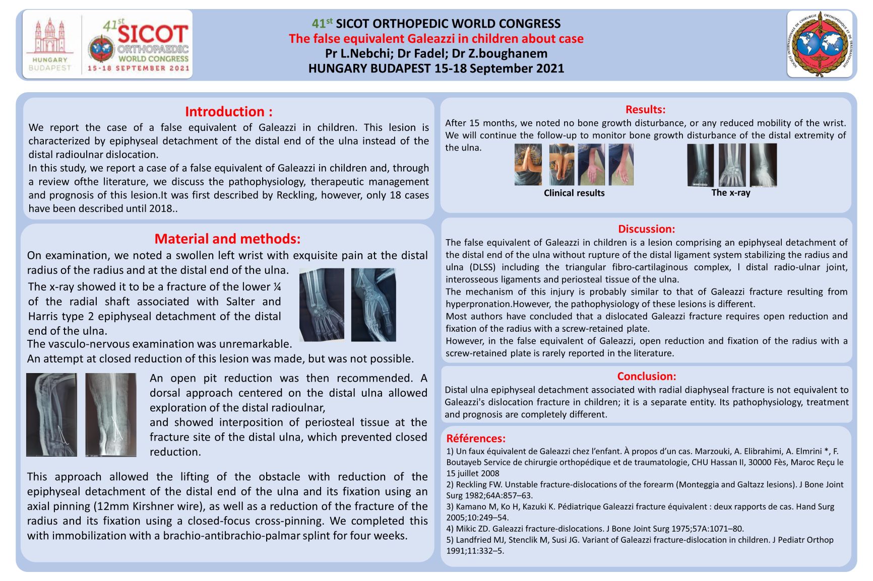 Summary: We report the case of a false equivalent of Galeazzi in children. This lesion is characterized by epiphyseal detachment of the distal end of the ulna instead of the distal radioulnar dislocation. A 16-year-old boy was injured after falling from his own height. The radiograph showed a fracture of the lower ¼ of the radial shaft with posterior angulation, associated with stage 2 Salter and Harris epiphyseal detachment of the distal end of the ulna. An attempt at reduction under general anesthesia was not possible. An open pit reduction was imposed. On exploration, the periosteum was torn and interposed in the fracture site, preventing reduction. The lifting of the obstacle allowed reduction and stabilization was maintained by axial racking-in for the ulna and cross-racking for the radius. We will continue monitoring to prevent growth disturbances at the distal end of the ulna.