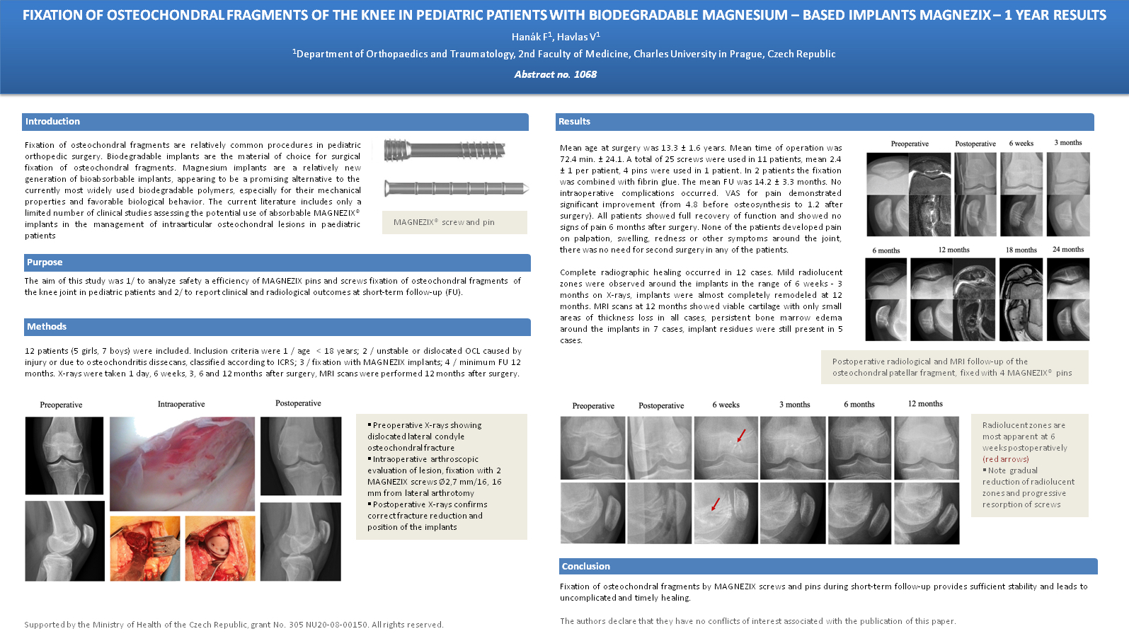 The aim of this study was 1/ to analyze safety a efficiency of MAGNEZIX pins and screws fixation of osteochondral fragments of the knee joint in pediatric patients and 2/ to report clinical and radiological outcomes at short-term follow-up (FU).