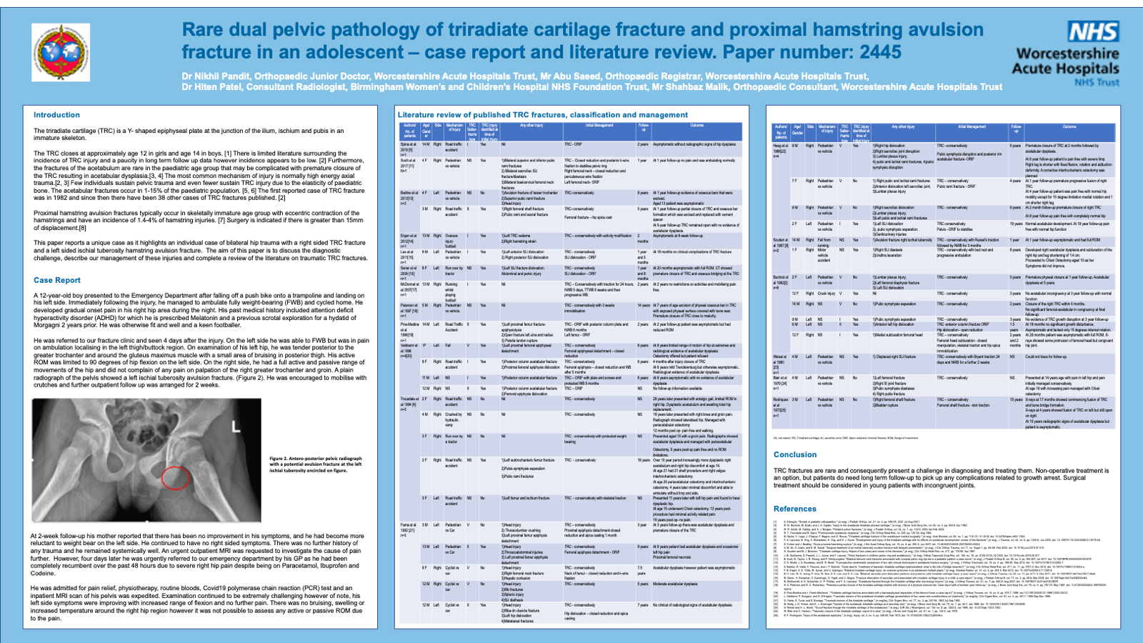 Background: Acetabular fractures occur in 1-15% of the paediatric population and fewer still sustain triradiate cartilage (TRC) injury. The literature surrounding the recognition and management of TRC fracture is scarce with no consensus on the most appropriate treatment. We present a case of 12-year-old boy with a TRC fracture and ischial tuberosity hamstring avulsion fracture. The aim of this paper is to outline the merit in conservative management in a 12-year-old boy presenting with dual hip pathology and a review of the literature.