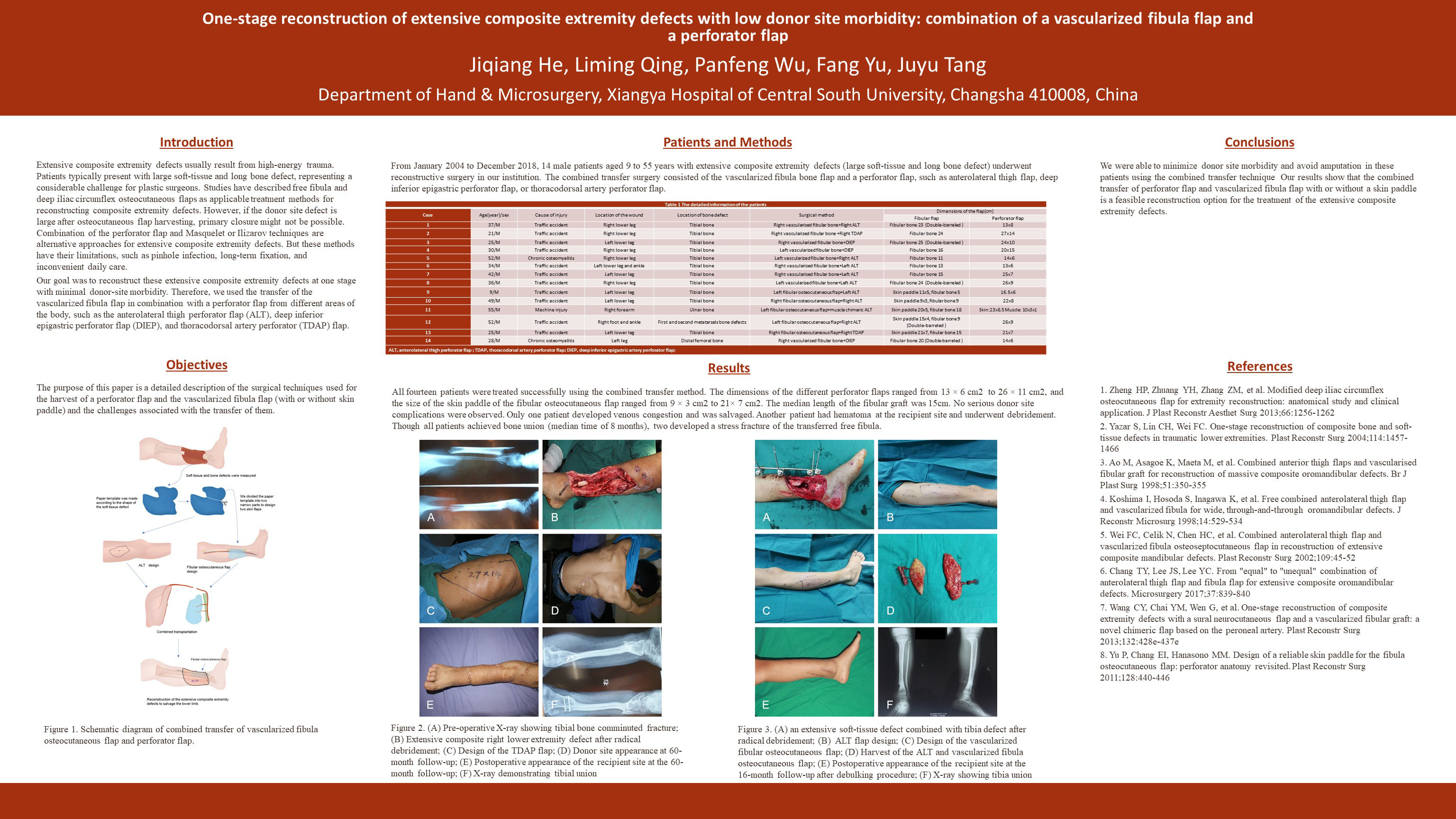Background: Extensive composite extremity defects remain a challenge in reconstructive surgery. In this study, we used combined transfer composed of the vascularized fibula flap and a perforator flap to reconstruct extensive composite extremity defects.Patients and Methods: From January 2004 to December 2018, 14 male patients aged 9 to 55 years with extensive composite extremity defects (large soft-tissue and long bone defect) underwent reconstructive surgery in our institution. The combined transfer surgery was consisted of the vascularized fibula bone flap and a perforator flap, such as anterolateral thigh flap, deep inferior epigastric perforator flap, or thoracodorsal artery perforator flap. Results: All fourteen patients were treated successfully using the combined transfer method. The dimensions of the different perforator flaps ranged from 13 × 6 cm2 to 26 × 11 cm2, and the size of the skin paddle of the fibular osteocutaneous flap ranged from 9 × 3 cm2 to 21× 7 cm2. The mean length of the fibular graft was 16.2 cm. No serious donor site complications were observed. Only one patient developed venous congestion and was salvaged. Though all patients had bony unions (mean time of 8.9 months), two developed a stress fracture of the transferred free fibula. Conclusion: We were able to minimize donor site morbidity and avoid amputation in these patients using combined transfer technique Our results show the combined transfer of perforator flap and vascularized fibula flap with or without a skin paddle is a feasible reconstruction option for the treatment of the extensive composite extremity defects.