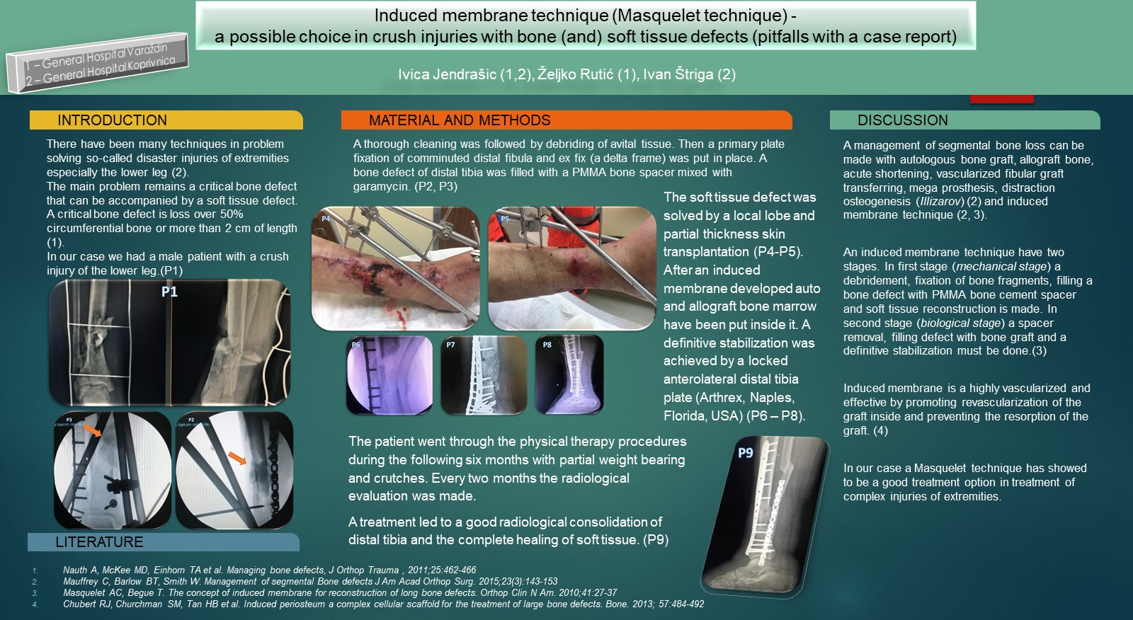 Introduction:There have been many techniques in problem solvingso-called disaster injuries of extremities, especially the lower leg. No general guidelines exist, except for main postulates in general surgery. The main problem remains a critical bone defect that can be accompaniedby a soft tissue defect. General approach is to debride dead tissue (soft tissue and bone), prevent an infection and provide a stable fixation leading to healing. Method:In our case we had a male patient with a crush injury of the lower leg. Initial treatment plan was made after the admission and diagnostic procedures. A thorough cleaning was followed by debriding of dead tissue. Then a primary plate fixation of comminuted distal fibula and an ex fix (a delta frame) was put in place. A bone defect of distal tibia was filled with a PMMA bone spacer mixed with garamycin. First, the soft tissue defect was solved by a local lobe and partial thickness skin transplantation. Second, a definitive stabilization was achieved by a locked anterolateral distal tibia plate. An induced membrane developed and auto and allograft bone marrow was put inside it. The patient went through the physical therapy procedures during the following six months with partial weight bearing and crutches. Every two months the radiological evaluation was made. Result:The treatment led to a good radiological consolidation of distal tibia and the complete healing of soft tissue. Conclusion:As conclusion, the Masquelet technique proved to be a good treatment option in treatment of complex injuries of extremities.