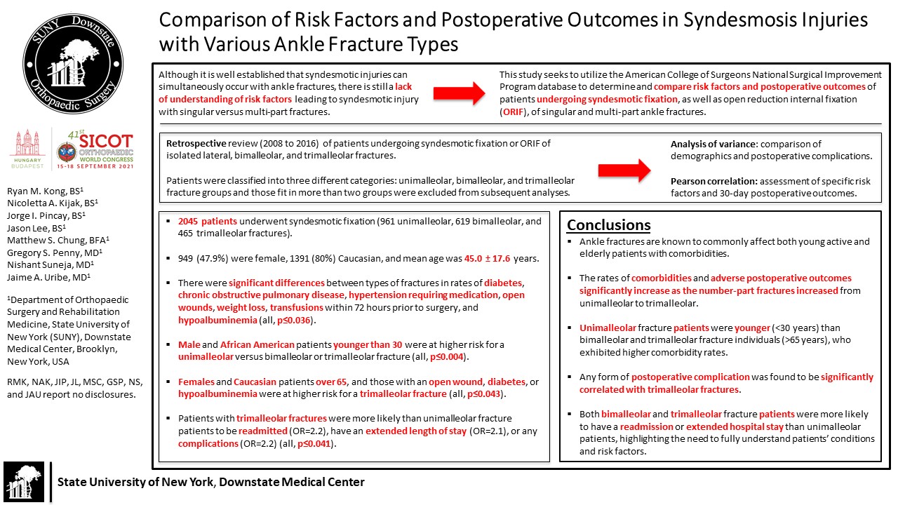 There is a lack of understanding of risk factors and postoperative outcomes of syndesmotic injuries with singular versus multi-part fractures. A retrospective analysis was done between 2008 and 2016, utilizing the American College of Surgeons National Surgical Improvement Program database. Patients with open reduction and internal fixation of isolated lateral malleolus fractures, bimalleolar fractures, or trimalleolar fractures were identified. A total of 2045 patients underwent syndesmotic fixation. Subjects with bimalleolar or trimalleolar fractures were more likely than those with unimalleolar fractures to be Caucasian (Odds Ratio [OR]=1.5 and 1.9), female (OR=1.8 and 2.9), above 65 years of age (OR=1.6 and 1.9) or have an American Society of Anesthesiologists (ASA) grade III (OR=1.5 and 1.4) (all, P≤0.028). Patients with a unimalleolar fracture were more likely than those with bimalleolar or trimalleolar fracture to be male (OR=1.8 and 2.9), African American (OR=1.5 and 1.8), under the age of 30 (OR=1.4 and 1.8), or present with an ASA grade I (OR=1.6 and 2.0) (all, P≤0.004). Subjects with bimalleolar or trimalleolar fractures were more likely than those with unimalleolar fractures to have lengthier hospital stays (OR=1.8 and 2.1), while patients with trimalleolar fractures were more likely than those with unimalleolar fractures to have hypoalbuminemia (OR=2.3), develop a complication (OR=2.2) or an open wound (OR=1.9), or to be readmitted (OR=2.2) (all, P≤0.036). Comorbidity rates and adverse postoperative outcomes significantly increase as the number-part fractures increased in syndesmotic fixation patients. Risk factors also vary across fracture severity.